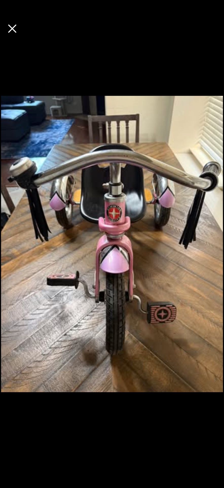 Pink Schwinn Tricycle with inflatable tires and bell on the handle bars