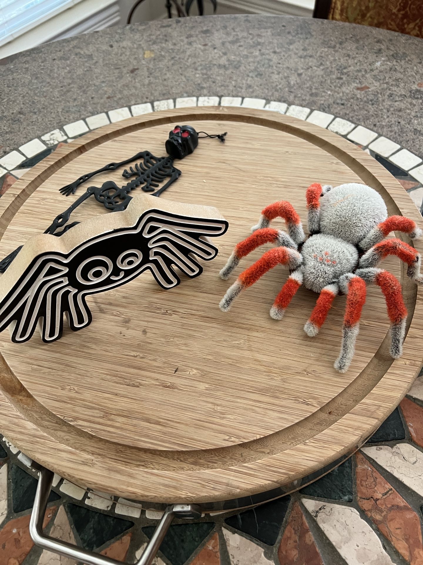 Includes a creepy spider, rubber skeleton, and wooden spider cutout.