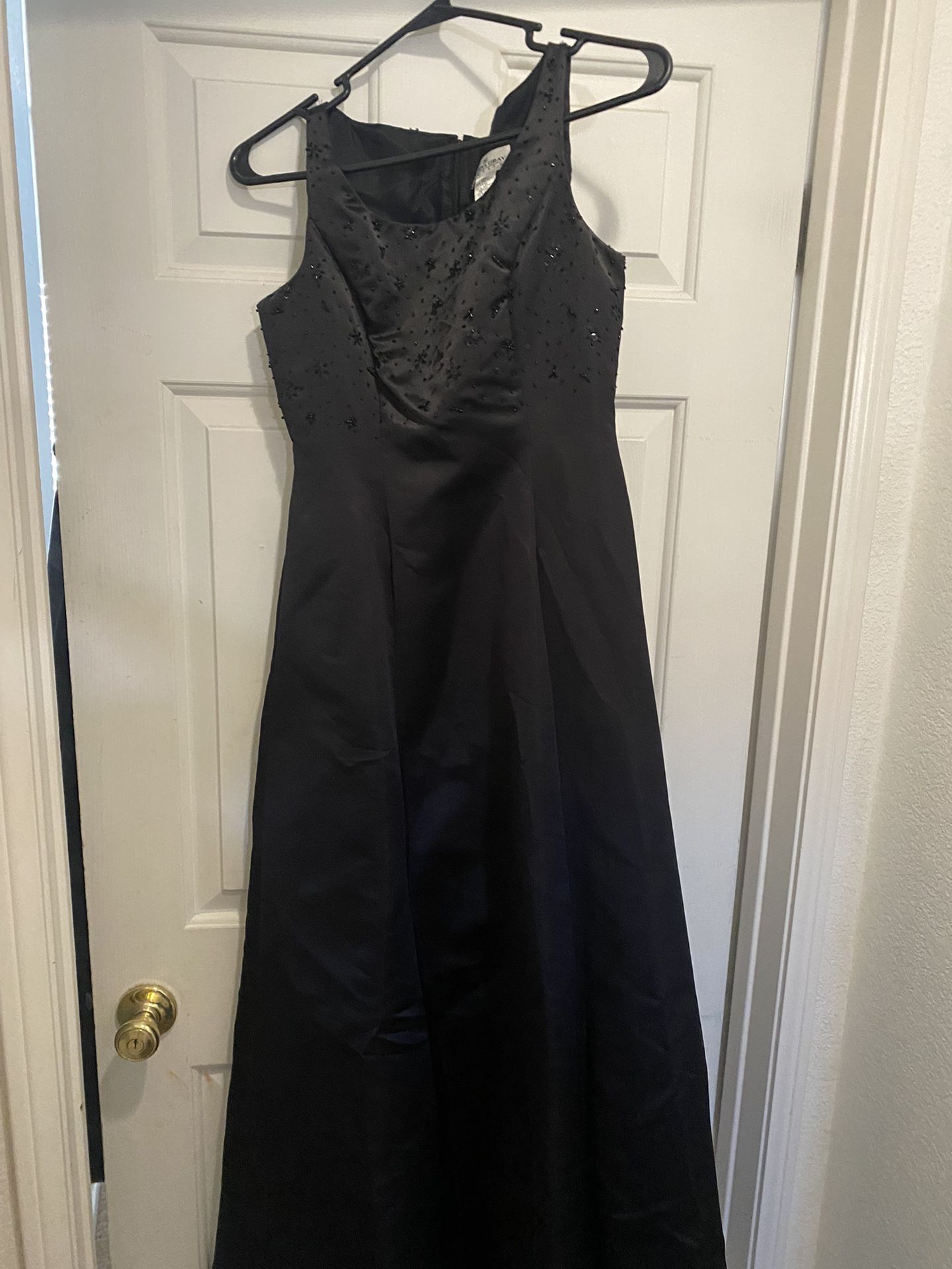 Prom dress, very beautiful black w/ beading on the top part of dress, zipper 1/2 way down the back. Size 4P.