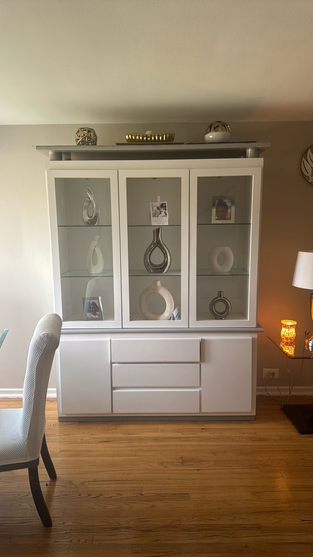 For sale: White China cabinet with 5 drawers on the bottom and 3 doors on top, featuring glass panels (one is missing). Additionally, I'm including a dining room table set with 4 matching chairs. Great opportunity to furnish your dining area with a beautiful and functional set. Make an offer or let me know if you're interested!