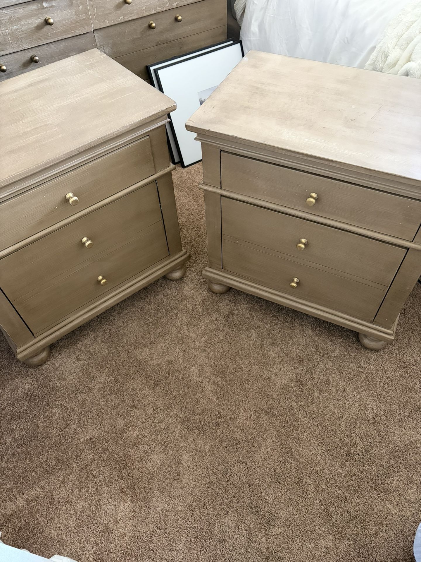 2 WOOD SIDE PAINTED BEDSIDE TABLES 28” long 18” wide 29” tall Slight indent in one side