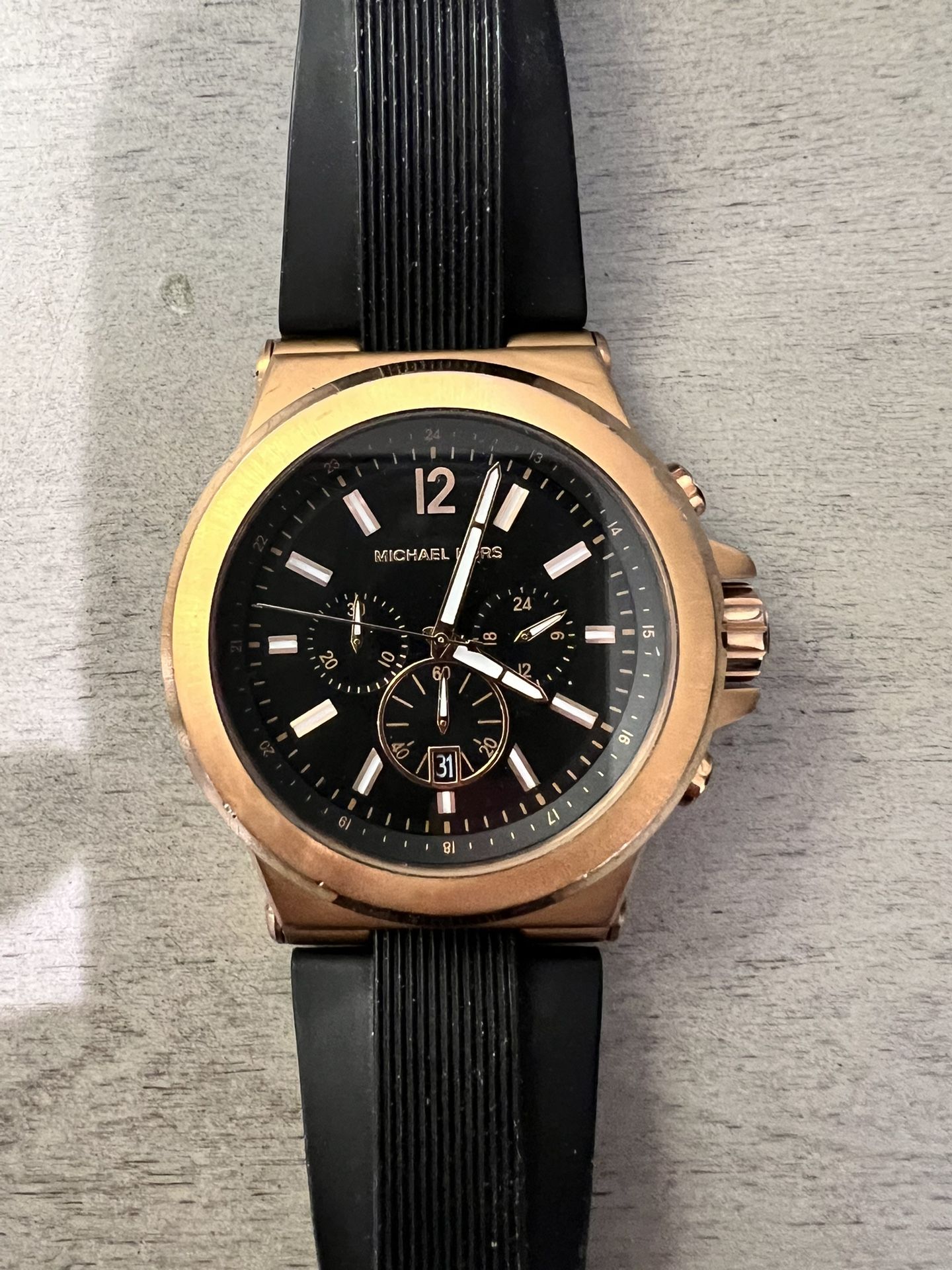 Used MK rose gold sport watch. Great condition. Black silicone band. Battery operated. Box not included. Price for new watch at Macy’https://offerup.com/redirect/?o=cy5jb20= is ~$200