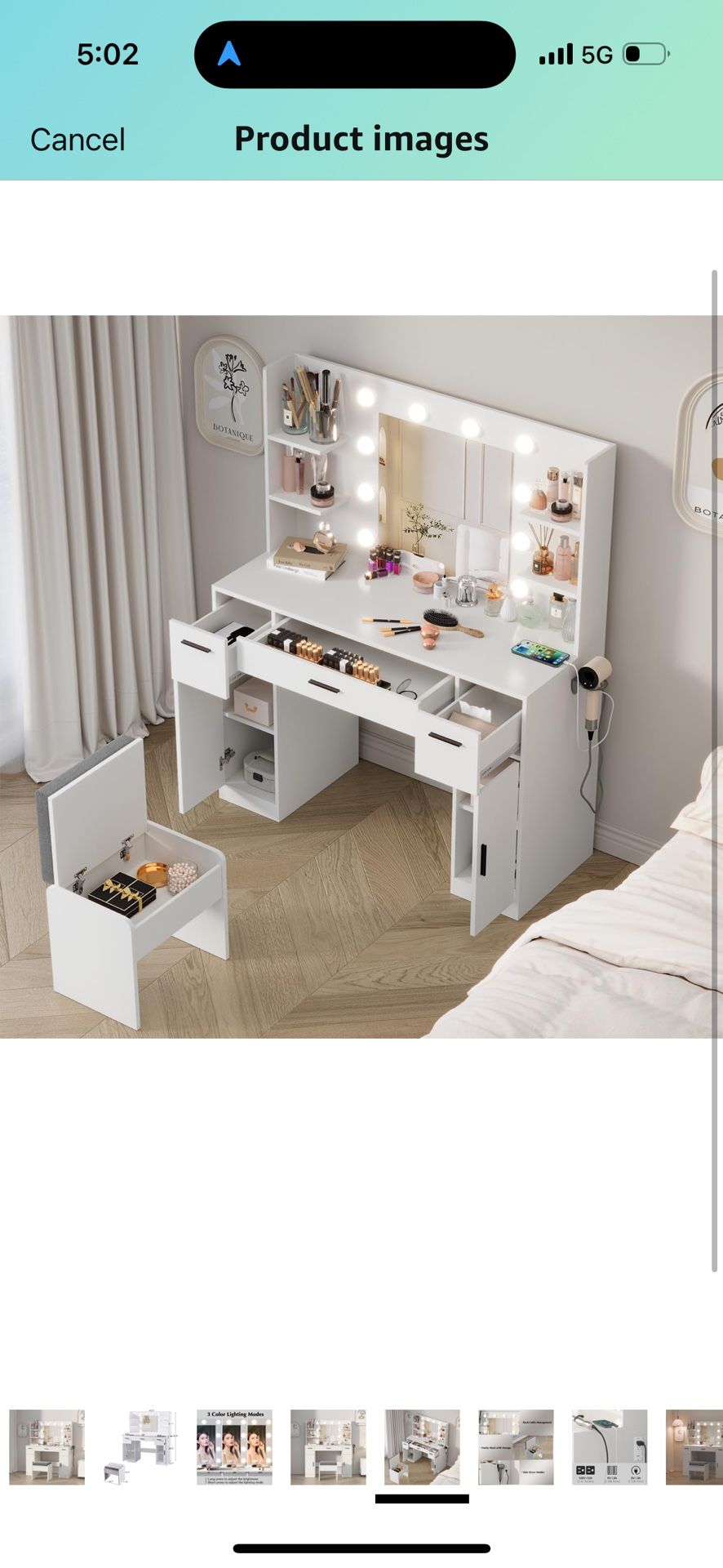 Vanity Desk with LED Lighted Mirror, Makeup Vanity Set with Charger Station and Chair, White Vanity Table with Drawer Dresser, Adjustable 3 Lighting M