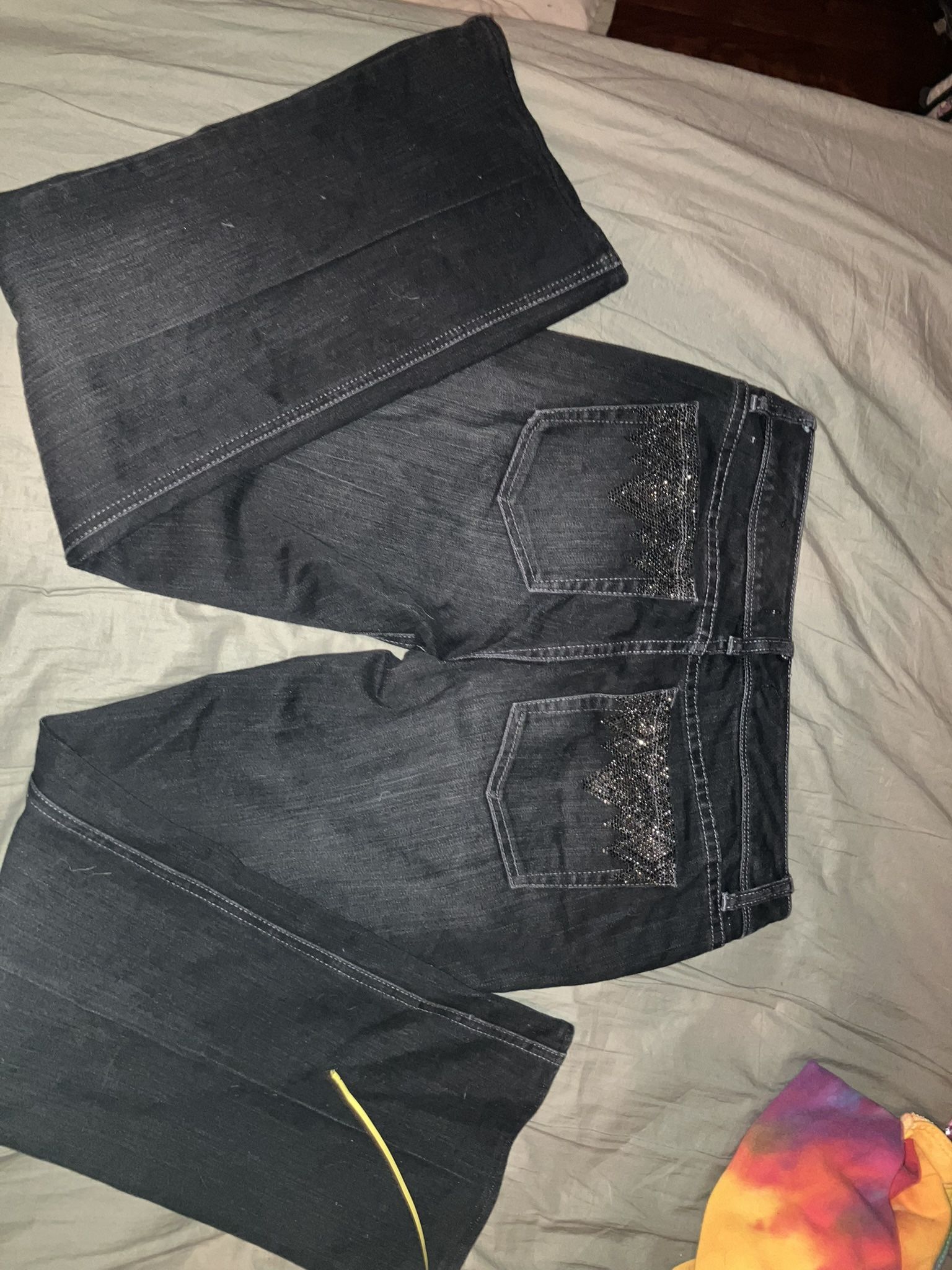 Like new low-rise jeans! Worn twice and never washed other than by hand and air dried to preserve the rhinestones and the black dye! Super flattering and flared!