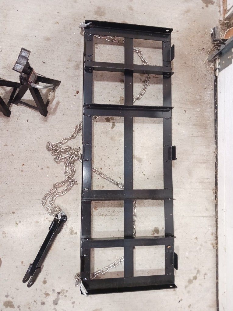 Iron Forge Tools Drag Harrow - Driveway Pull Behind Lawn Leveling Rake Grader - Tow Behind Lawn Tractor Attachments for ATV, UTV, or Mower - 4 Feet Heavy Gauge Powder Coated Welded Steel - Black Priced to go, make me a reasonable offer. I have bought a new tractor and I am selling all the equipment that my old Craftsman (Husqvarna) garden tractor utilized. Priced to go, make me a reasonable offer. This harrow is brand new, never used, always kept inside the garage. Retails new for $190, excluding taxes, delivery etc. Buyer must collect, cash only.