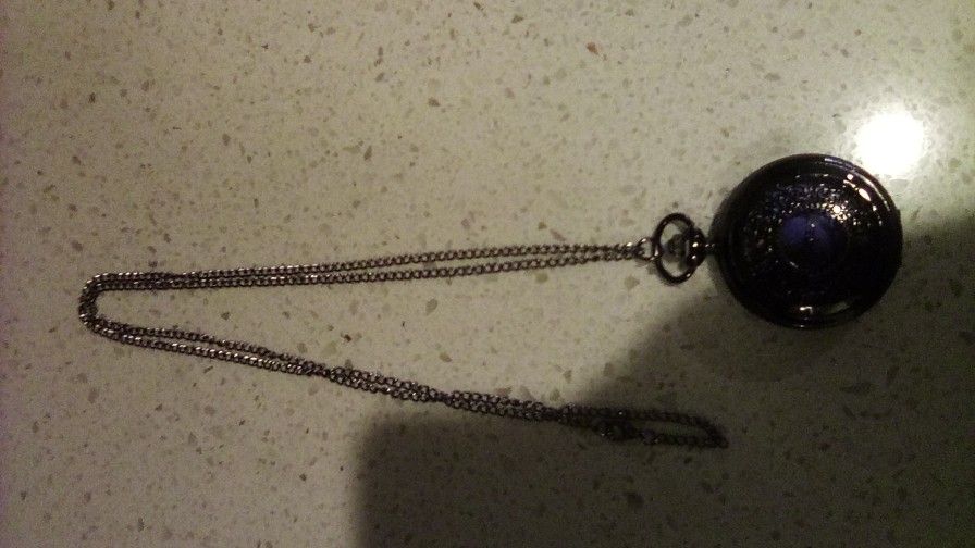 There's very stylish pocket watch with flip open see-through door is it beautiful timepiece for some reason it's on a chain that's why that is instead of a pocket watch chain if interested I might be able to acquire a pocket watch chain for it