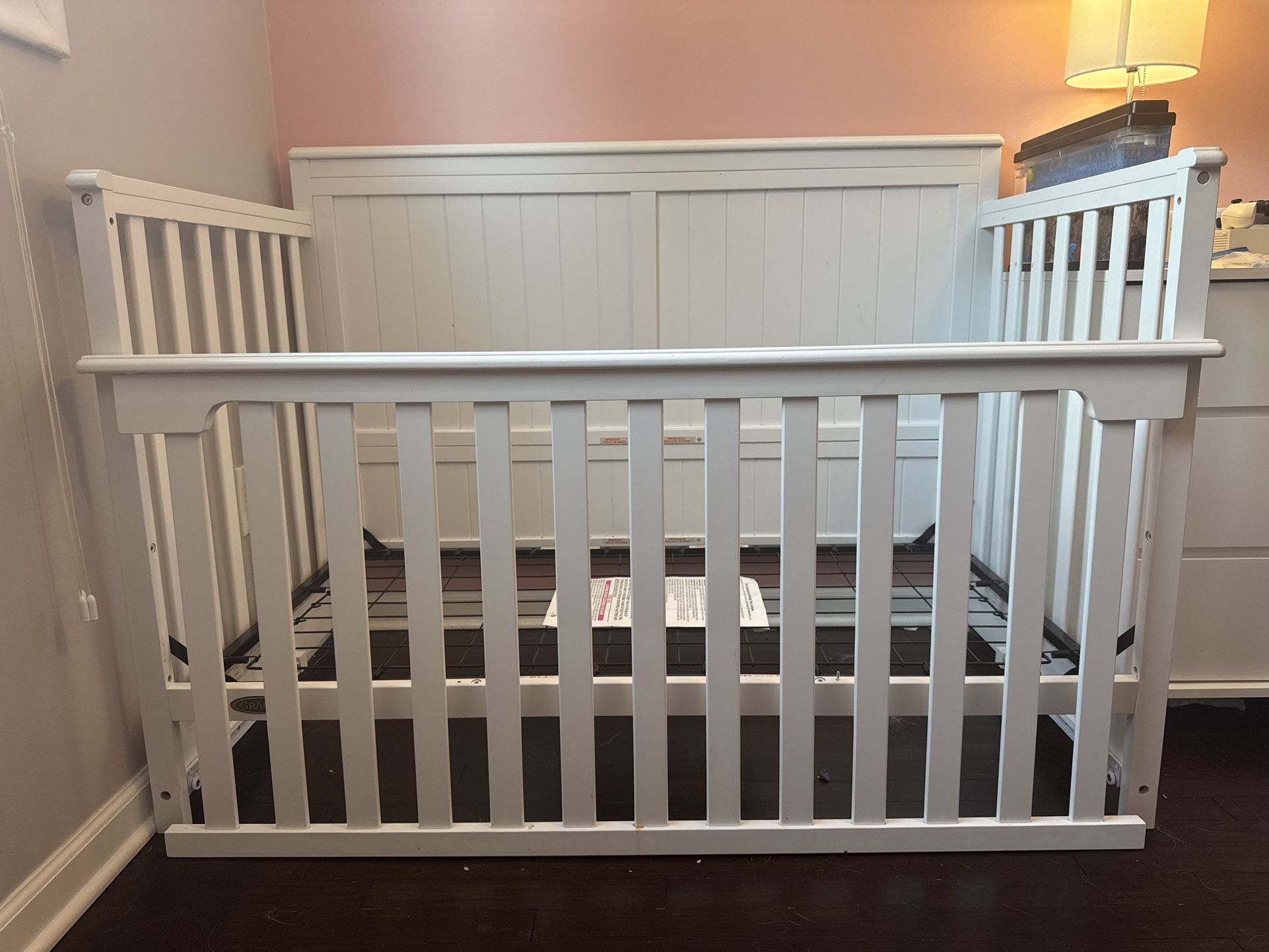 Ready to go today! Transforms into a baby crib, toddler bed, and kindergarten bed. Includes under bed drawer and parts still labeled. All parts in a bad with hand tool.