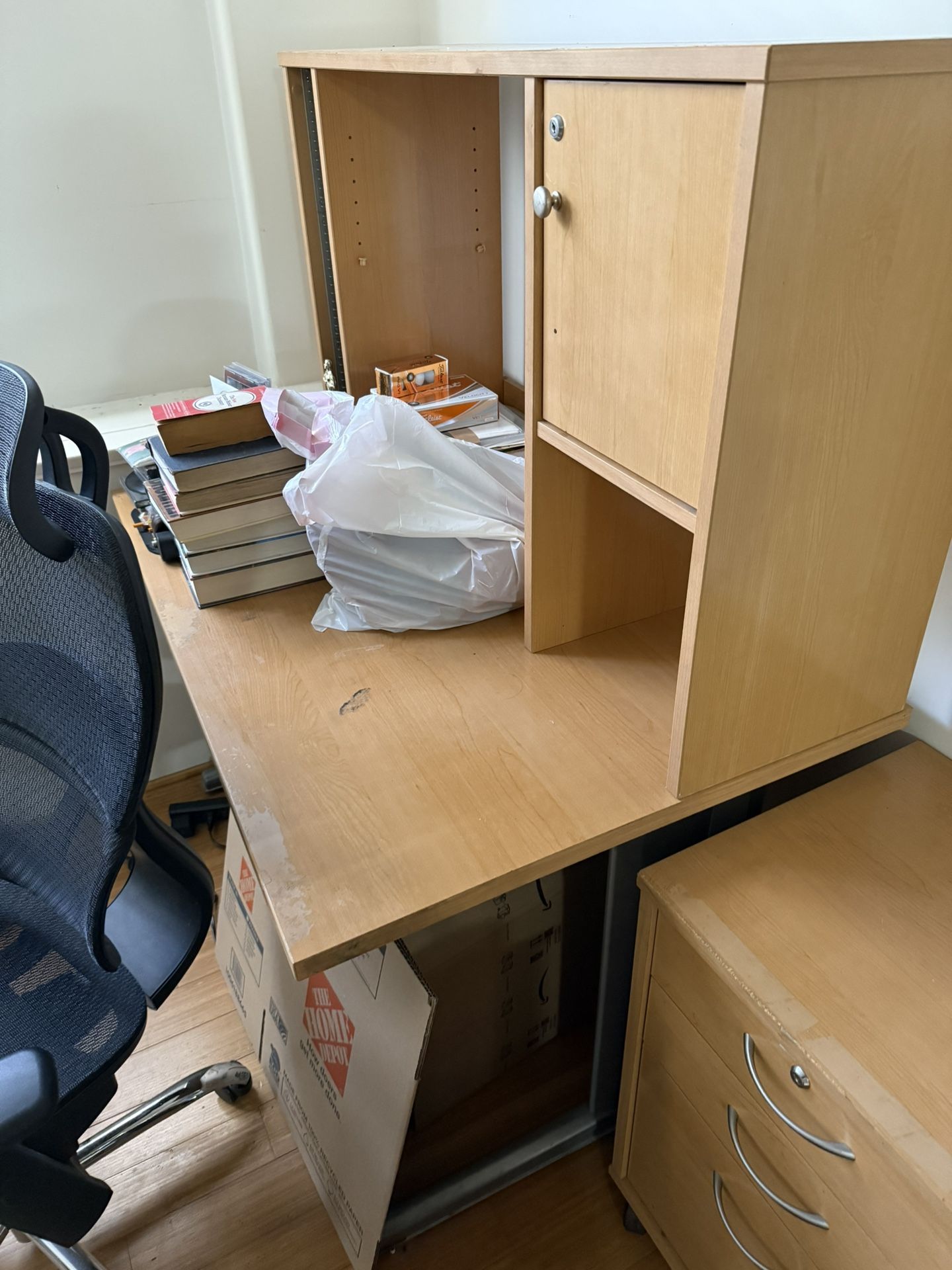 Moving. Must pick up Friday, 11/28. Must be purchased together. $200 OBO. 1x 3-drawer cabinet. About 3ft high x 2ft wide. Good for file folders and paperwork. 1x Computer desk. About 5ft high, 4ft wide, 3ft deep. Top comes off. CD storage. Cupboard storage. 2x 3-drawer storage dressers. About 3ft high, 4ft wide, 2-3ft deep. One handle loose can be easily fixed. Good for odds and ends.