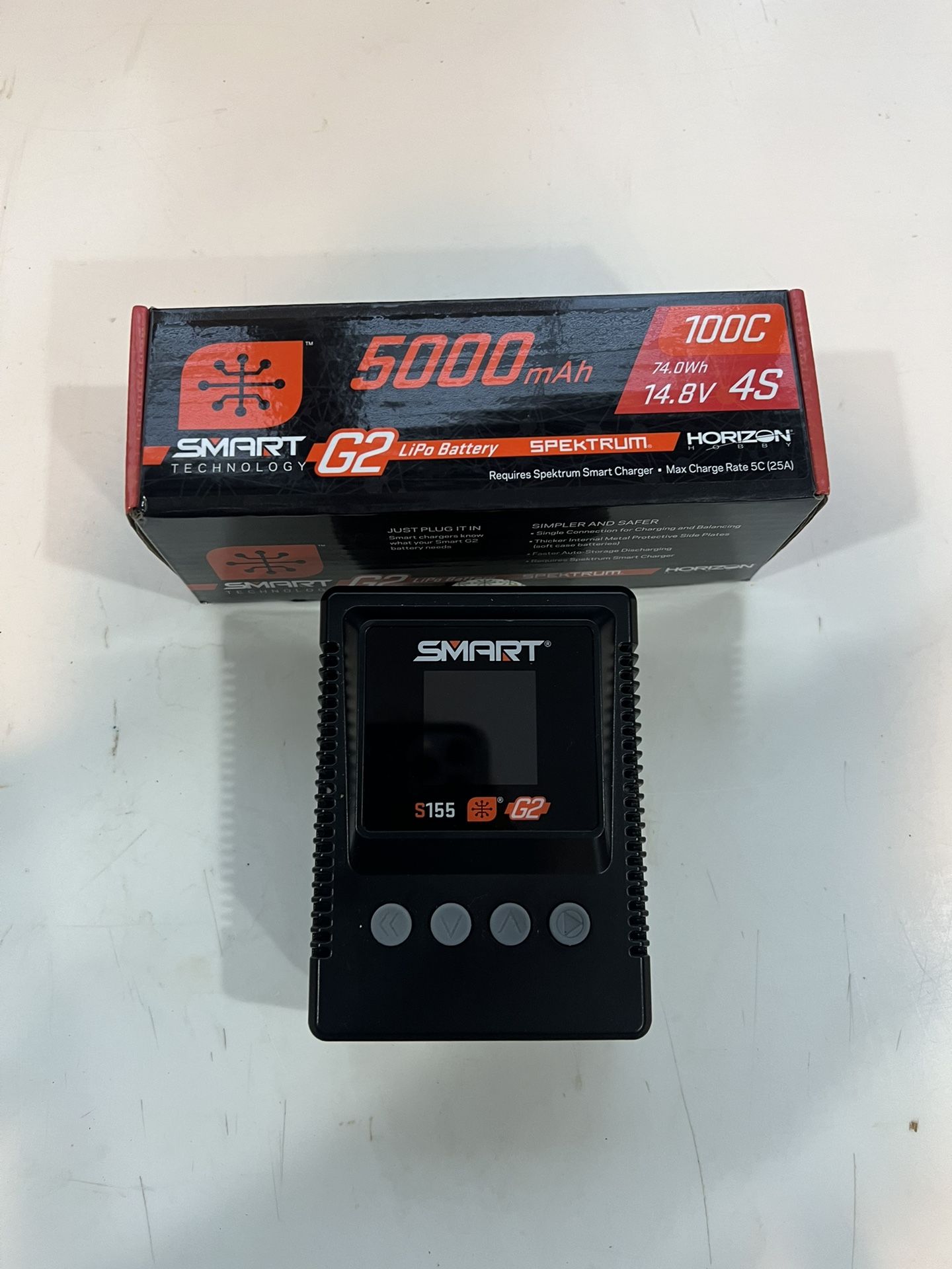 Battery has never been used and the chargers been barely used. Both in perfect condition. Spektrum 4s lipo battery 5000 mah 14.8 volts 100c. Charger is a S155 G2 smart charger. Smart charger will give you details on the batteries history, if you go to settings. It will say 0 or 1. if you can pick it up, I will gladly lower the price *this listing is available*