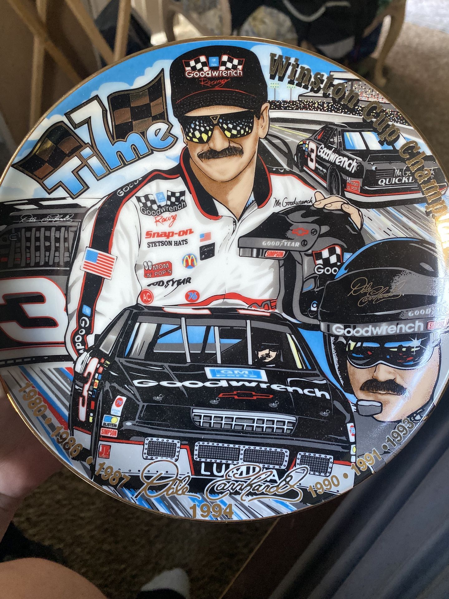 Subject: Features Dale Earnhardt, his iconic #3 Goodwrench Chevrolet, and his seven championship years. Design: The plate includes bright graphics and is trimmed in 22kt gold. Dimensions: The ceramic plate measures approximately 8 inches in diameter. $15 FIRM