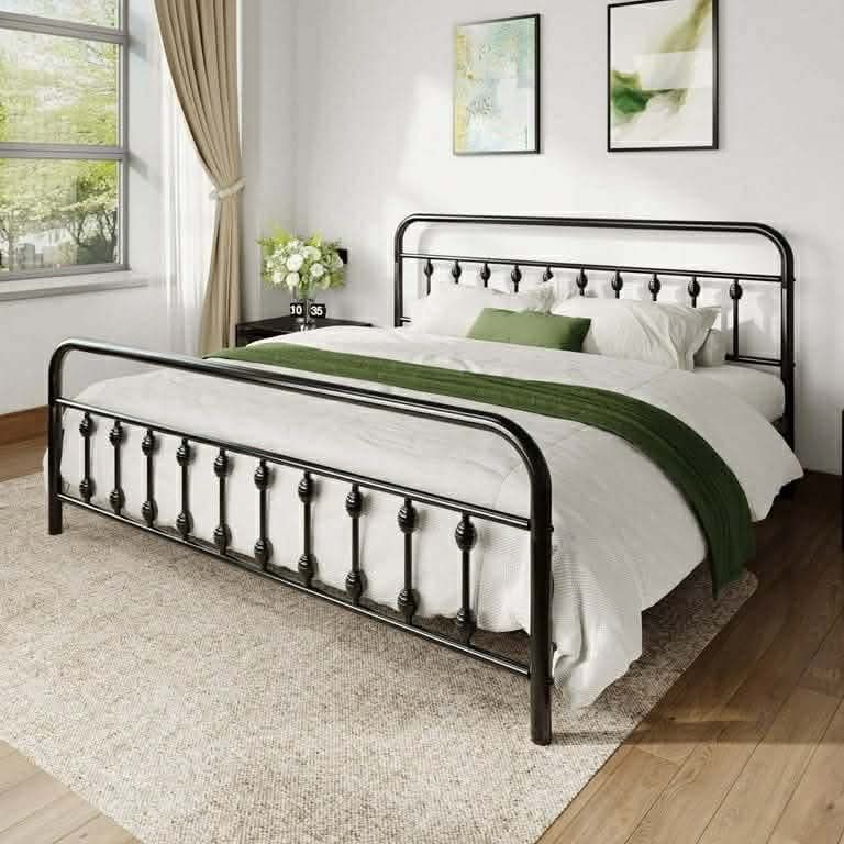 King Metal Platform Bed Frame with Vintage Pattern Headboard/Footboard, No Box Spring Needed, Black