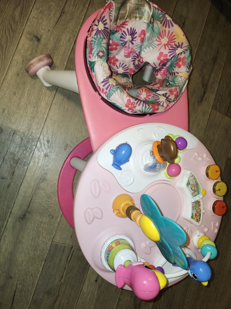 Likely used. I cleaned it up. Baby can sit and move around in circle in it while playing with the toys on top.