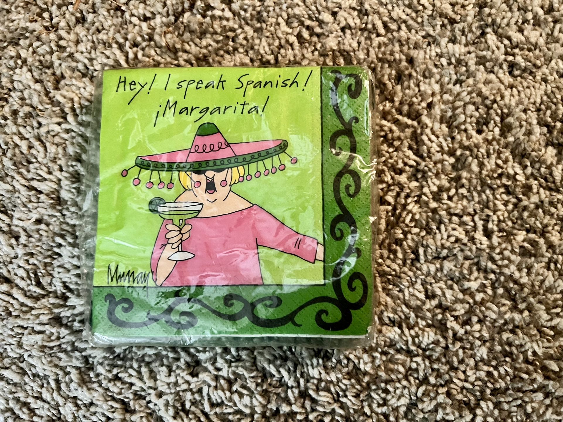 New/sealed Design Design beverage napkins with the “Hey! I speak Spanish! ¡Margarita!” graphic. Bright green party vibe—great for taco night. • 20 napkins (3-ply) • Size: 25 cm x 25 cm (approx. 10” x 10”)