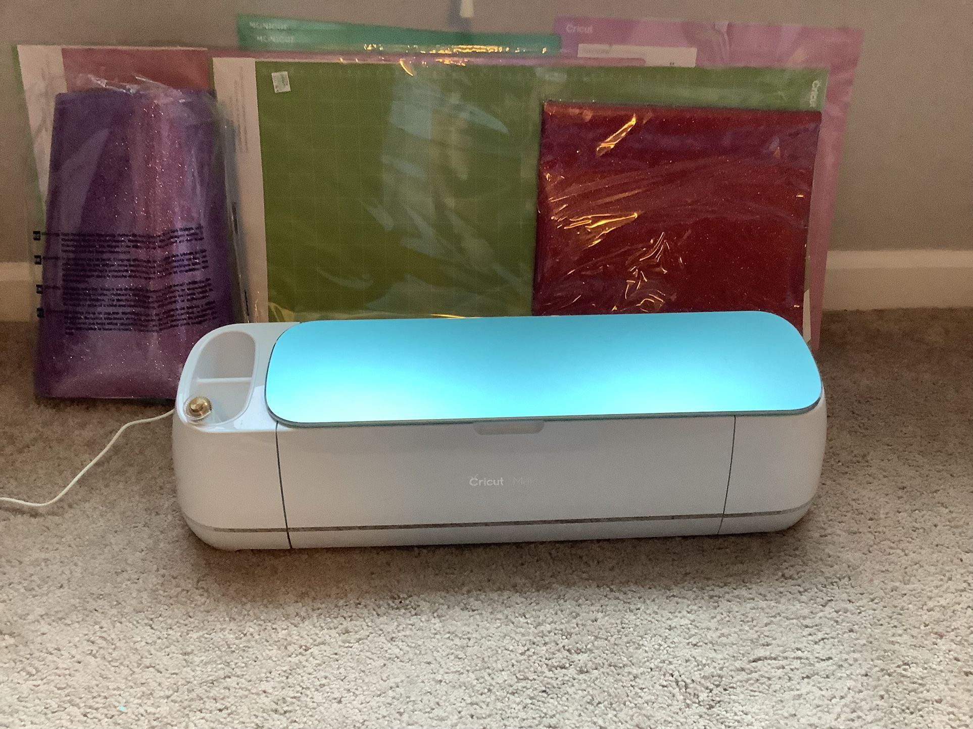 This listing is for a Cricut Maker and supplies. It was purchased in 2019 and very lightly used (approx. 10 -20 cuts). Also included: 3 12x12 standard green cutting mats Assortment of heat transfer vinyl-including solids, glitters and checked patterns The Cricut Maker is the higher end of the Cricut machines. It cuts paper, cardstock, fabric, leather, balsa wood and more. Out of the box, it doesn’t come with manuals, but set up information and use instructions can be found on the Cricut website. There are also many, many YouTube videos.