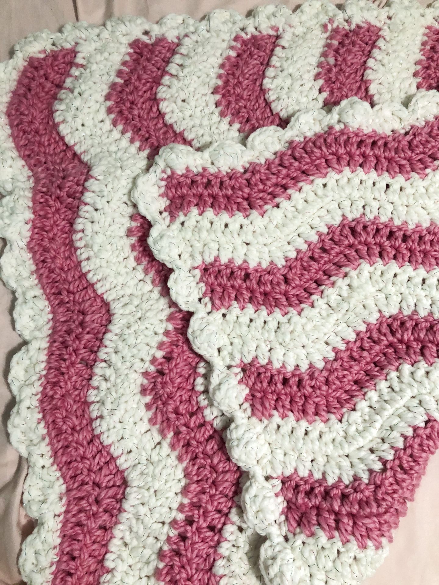 Soft and thick crochet wool baby blanket Pink and white (the white has a colorful shiny detail) Size: 32 x 30 1/2 ~Handmade with love~
