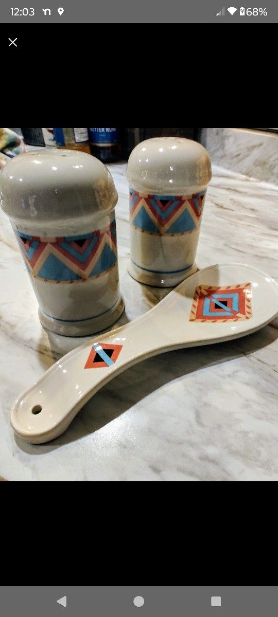 Vintage Sango Zuni set. Salt and pepper shakers and a spoon rest. No cracks nor chips.