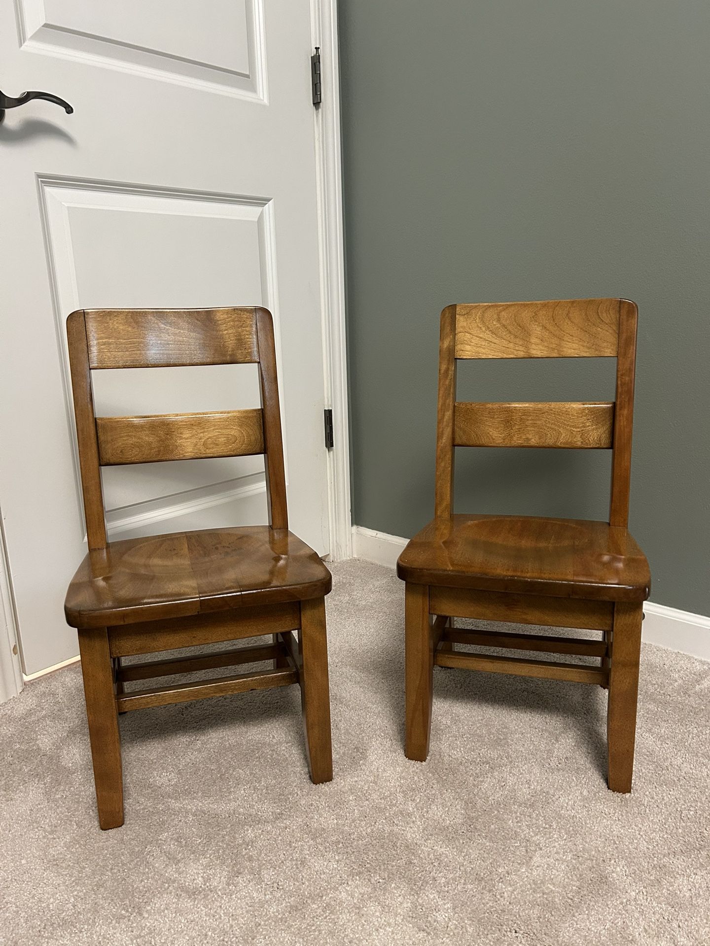 These are not your typical lightweight children's chairs. This pair of solid hardwood seats features a weight and structural integrity that rivals fine adult dining furniture. The wood grain is absolutely stunning, finished in a rich honey-gold lacquer that has a deep, glass-like shine. Designed with a classic ladder-back and a deeply contoured saddle seat for comfort, they are as beautiful as they are sturdy. Perfect for a high-end playroom or as a durable "mini-me" addition to a kitchen or dining area. Specs: • Dimensions: 11.5" W × 10.5" D × 22.5" H • Materials: Premium Solid Curly Maple Wood, High-Gloss Lacquer • Construction: Reinforced stretchers, saddle-carved seat Condition: Excellent condition with a brilliant, high-gloss finish. The frames are rock-solid with no wobbles or loose joints.