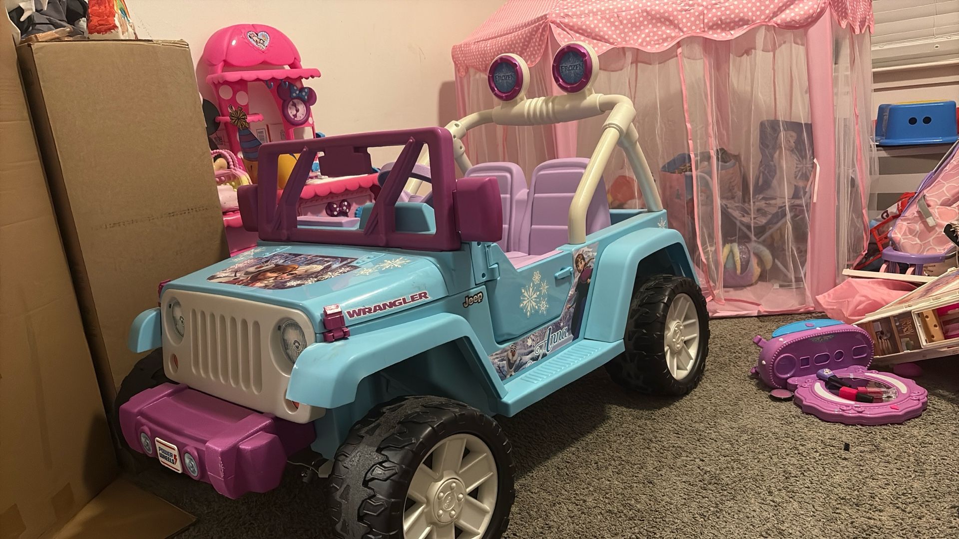 Kids Frozen Elsa ride-on Jeep, battery powered and in good working condition. Features realistic Jeep design, Elsa graphics, working lights, sounds/music, and forward/reverse drive. Easy to use and fun for toddlers and young kids.
