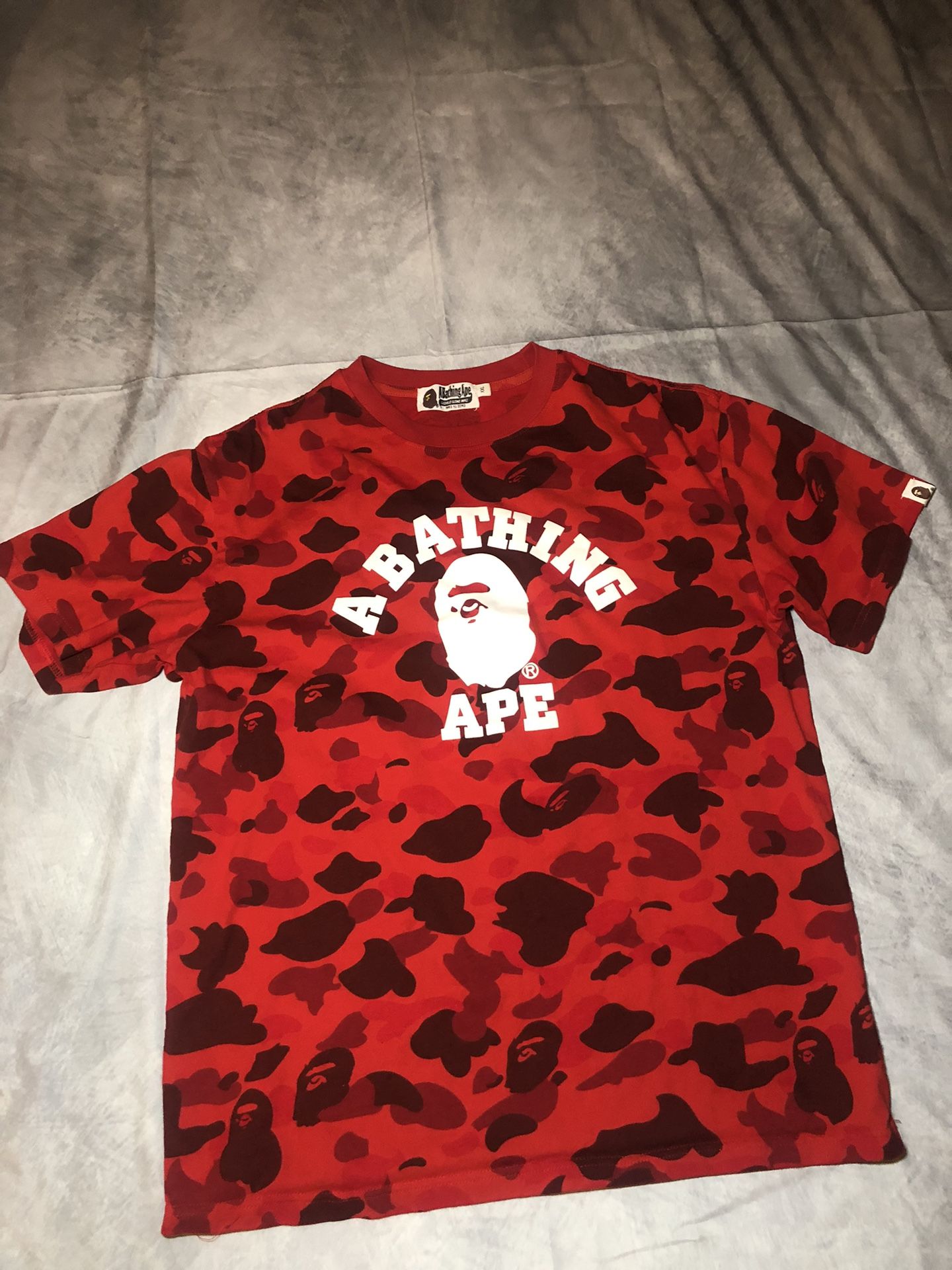 Uncleanable Stains Pictured 24-48 hour shipping guaranteed (Except Weekends) When you buy this you’re buying it as it is, no refunds or returns of any kind. Don’t Mind The Tag Fits More Like A large or medium please compare measurements below to your measurements to make sure it fits you. it may not fit you like a large like it did me. Measurements -Chest 20.5 Inches -Waist 21 inches -Seat (Shirt Bottom) 21 Inches -Bicep 8 Inches -Shirt Length 26 Inches -Should Width 19.5 Inches -Sleeve Length 17.5 Inches bape, bathing ape, A bathing ape, red, black, hypebeast, t shirt, designer, streetwear #streetwear #bathingape #bape #hypebeast #tshirt