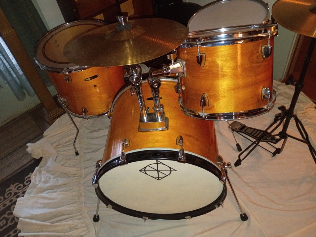 20" Bass, 15" Floor tom. 13" Snare, 12" Rack tom. Brand new Aquarian Super kick ll. No pedal marks. Comes with brand new High hat stand with 12" cymbals, and 14" crash. No brand marks. Throne, snare stand, bass pedal, cymbal stand mount on bass drum. Big sound and tone!
