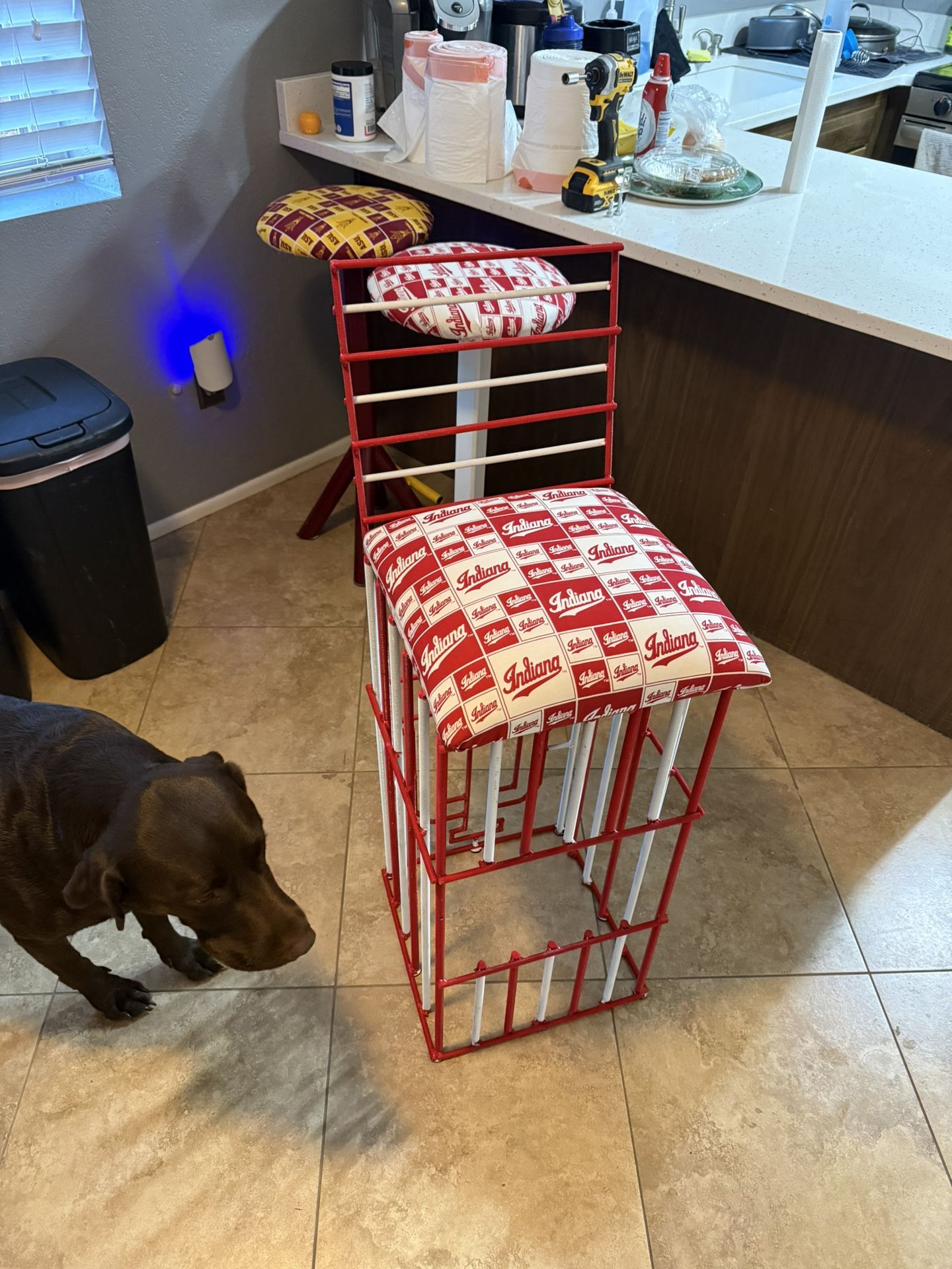 Indiana Hoosier bar chair with logo on the back and a brand new seat cushion! Made of metal.