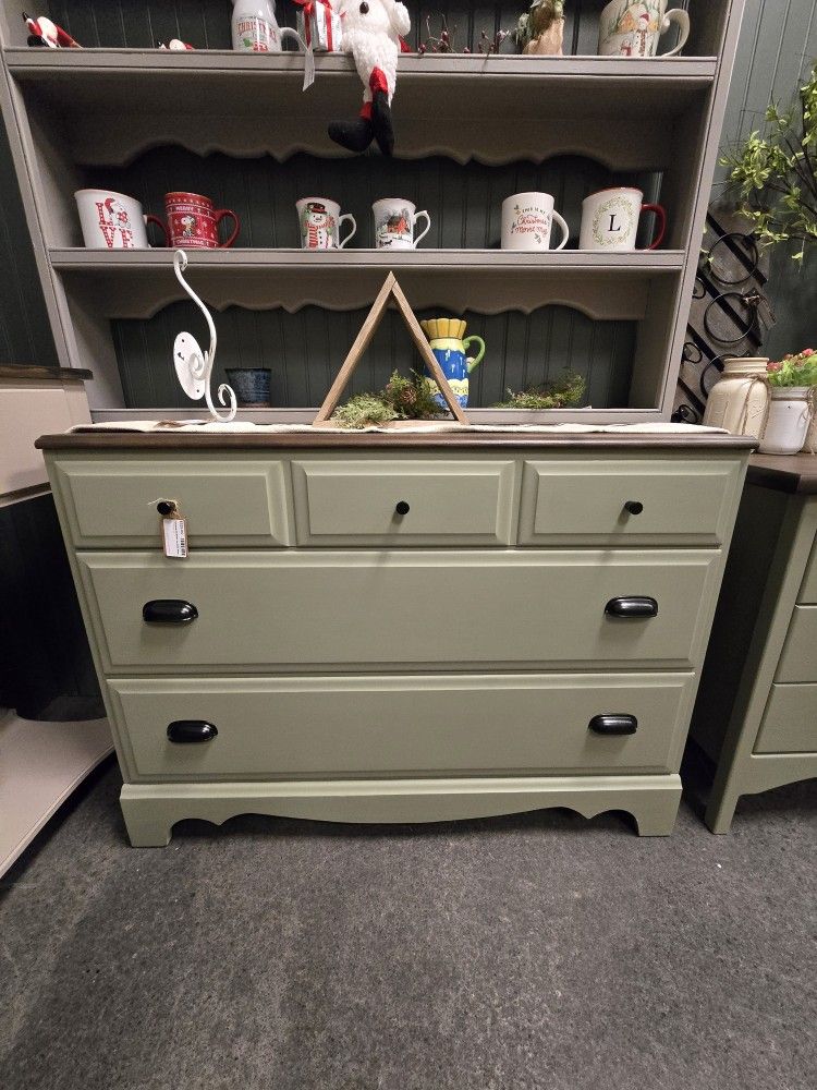 Solid wood dresser and matching nightstand in a soft sage green with a warm natural top. Charming farmhouse style with timeless character and practical storage—perfect for a cozy, inviting bedroom. Dovetailed drawers. New black hardware. Priced seperately Dresser $325+tax 41-1/8" long X 17-3/4" deep X 30" tall Nightstand $135+tax 28-1/4" wide X 17-5/8" deep X 23.5" tall Available in Buckley @ Waymans Vintage Market Sold as set for $420+tax