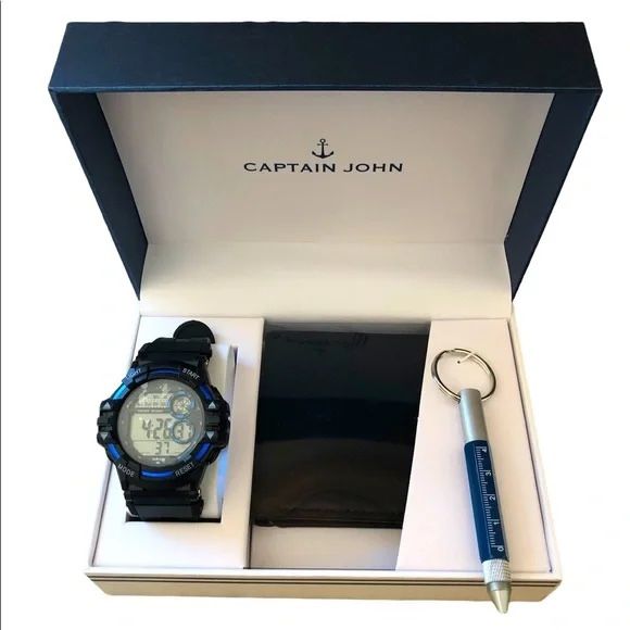 Sports watch, black wallet and key chain measuring stick. Packaged in a navy blue nautical style box. Brand new. Never used.