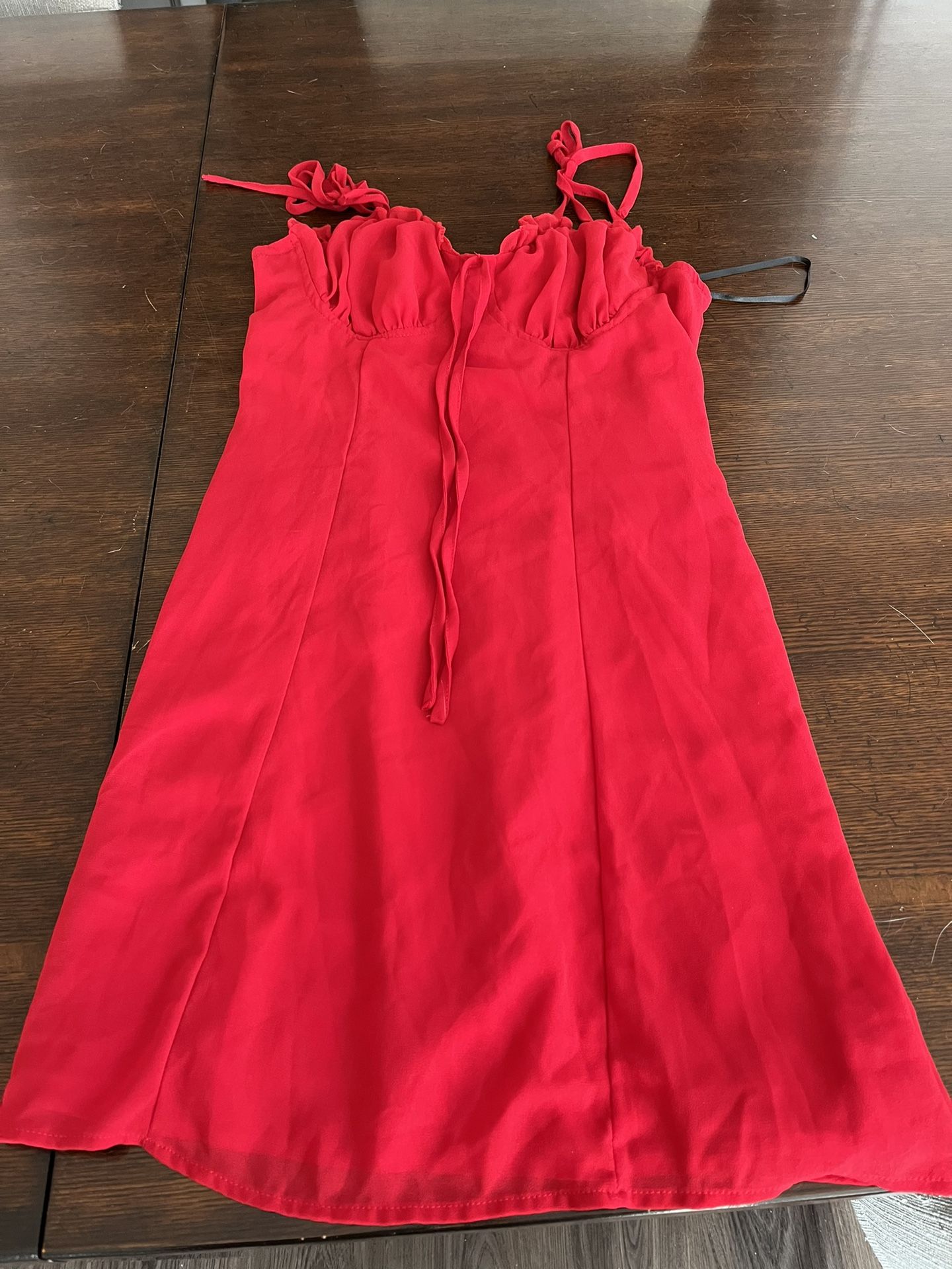 Very good deal. Red dress. Daughter wore twice and stored this. No tag. Purchased from SHEIN. It is a small or medium size. Taken care of since it was primarily stored. Might need to be slightly ironed. Cash only. Will meet at local McDonald’s to avoid shipping costs for buyer. Need to sell of daughters belongings before she heads off to the University.