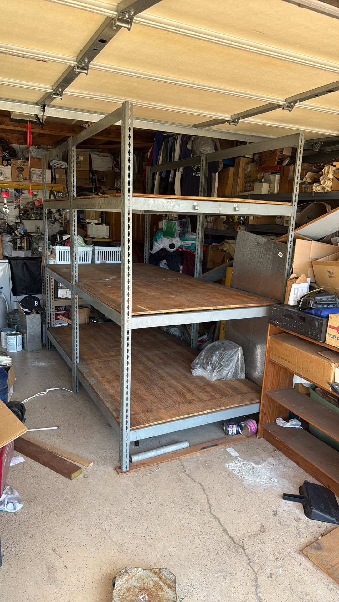 Metal storage shelf, gorilla rack, three-quarter inch plywood 4 feet wide by 8 feet long by 7 feet tall three shelves. This is a monster rack that will store half a garage.