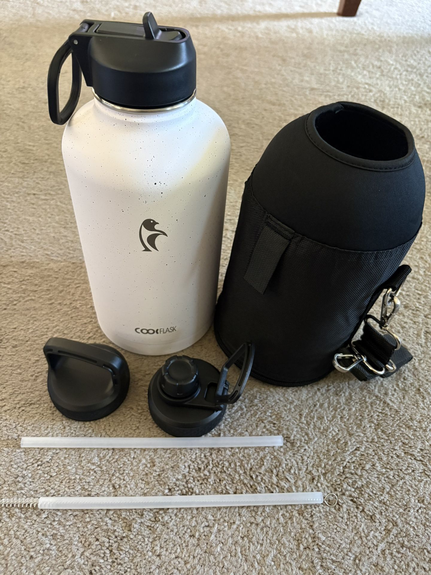 Awesome COOLFLASK 64oz water bottle set. This white bottle keeps drinks cold. Comes with a black carrying sleeve, two straws, and a straw cleaner. Super complete for staying hydrated. Keeps ice 48-72 hours. Respond to this post or text 602918three599. I’m in Peoria.