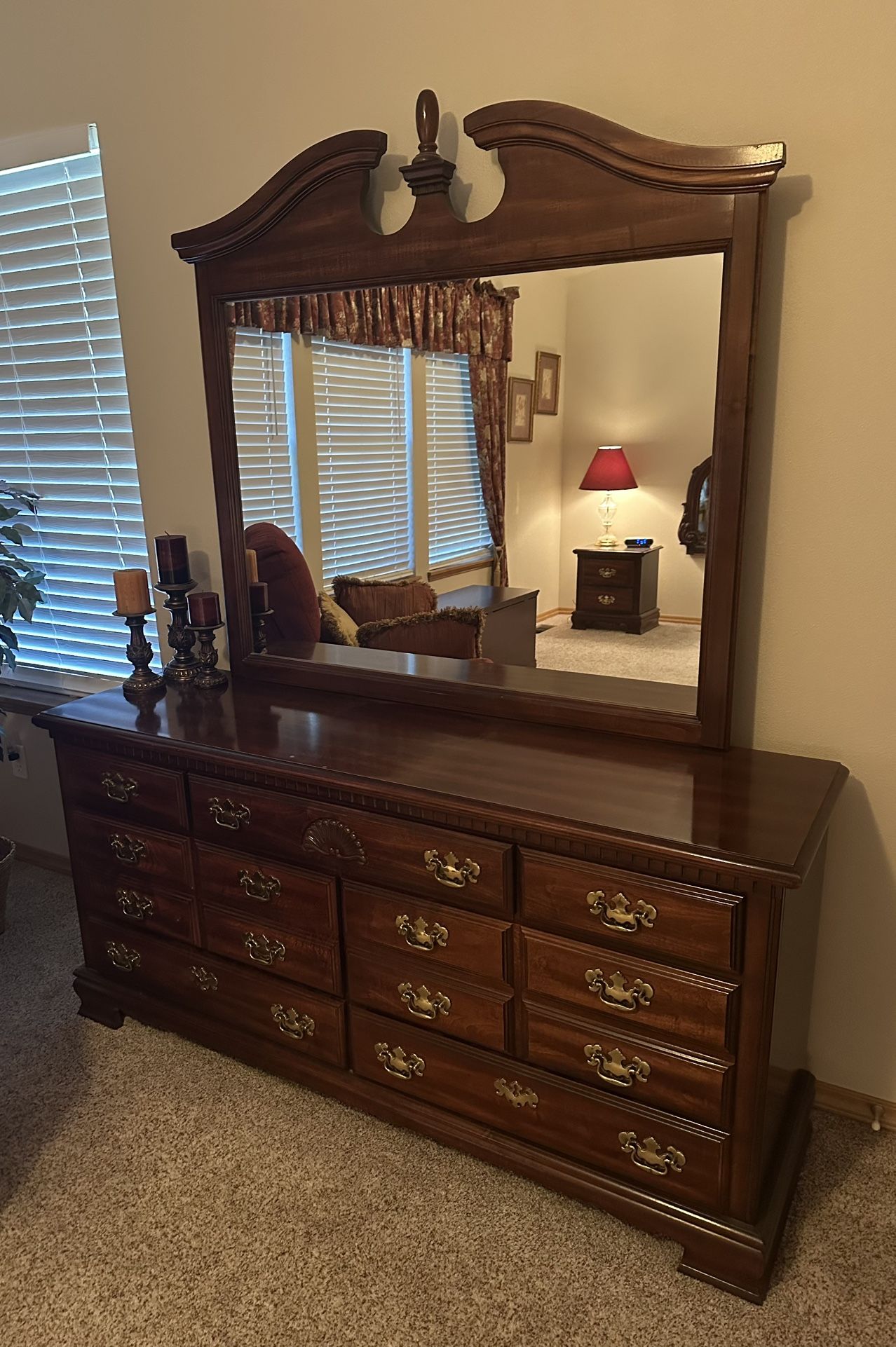 🛌 Selling this cherry wood (REAL WOOD) traditional style bedroom suite as a complete set which includes: * 2 identical night stands each measures 20”Lx16”Wx23”H * Chest of drawers measures 36”Lx18”Wx52”H (from the top there’s a regular drawer, double drawer, regular drawer and 2 slightly bigger drawers on the bottom) *Triple Dresser measures 64”Lx16Wx31”H *Triple Dresser Mirror measure 48”Lx1”Wx46”H No pictured decor is included in price but IS available for sale. No Delivery Available PU in Kennewick near Canyon Lakes Golf Course