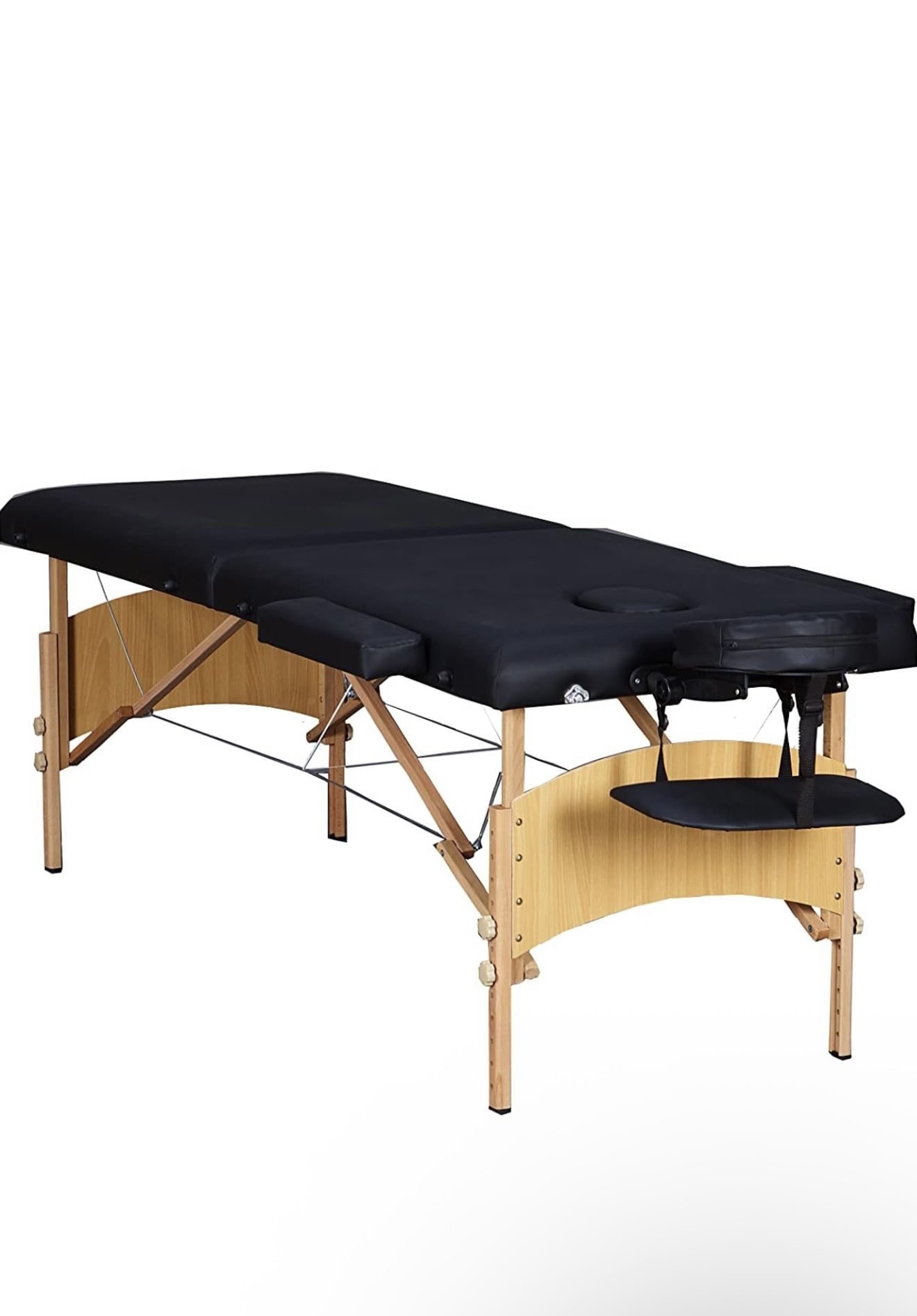 84” black portable folding massage table with carrying case. With 5 additional extension pieces Includes black rolling chair.