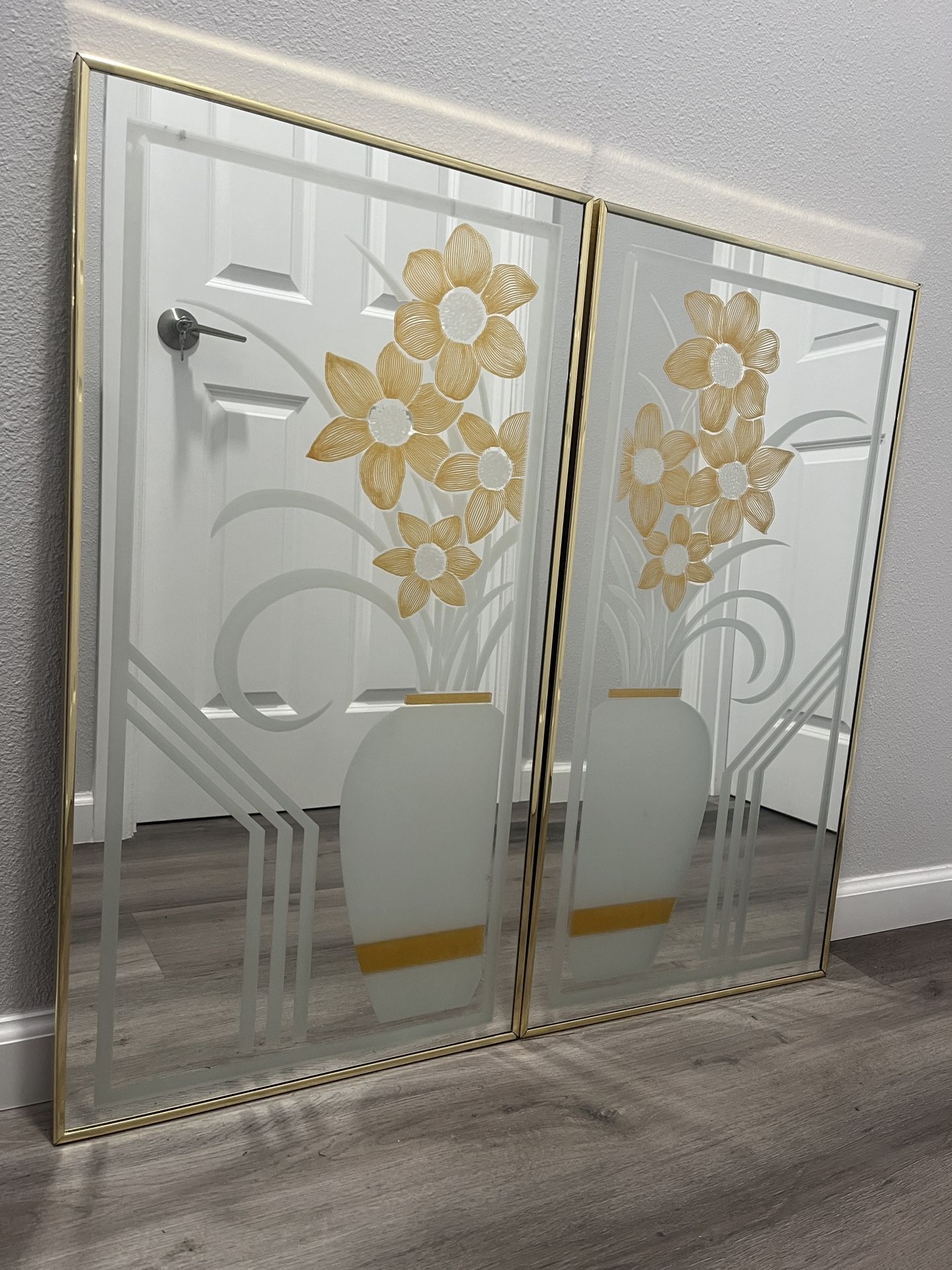 Pair of mirrors from the late 70's with deco like design of vase & yellow flowers. (Last image shows current Google search of selling & sold posts for JUST ONE mirror for $299-$400. ) Selling the pair for $70! ** Pick up at King Richard's Antique Mall 12301 Whittier Blvd Whittier. Space 1690. Downstairs, 5th space on the left. 36" tall X 18 " Two together = 36" wide.