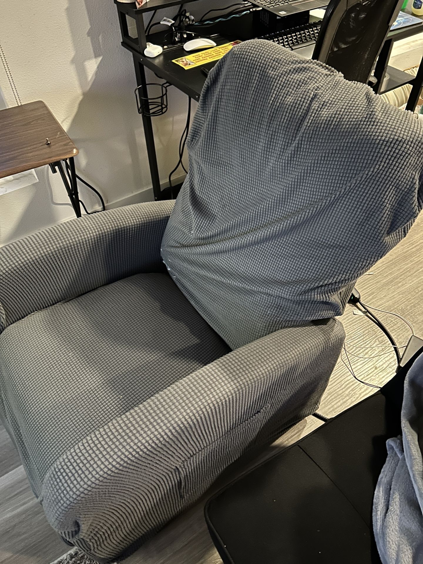 Smallish gray recliner in decent condition. Nice for a studio apartment. Willing to negotiate on price