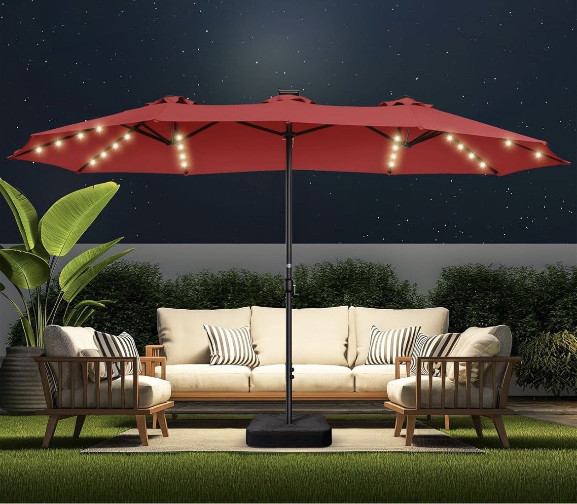 New in box-Double Sided Patio Umbrellas - 15ft Solar Lights LED Lighted Outdoor Extra Large Market Table Umbrella with Base Included, Oversized Umbrella for Deck, Pool, Backyard