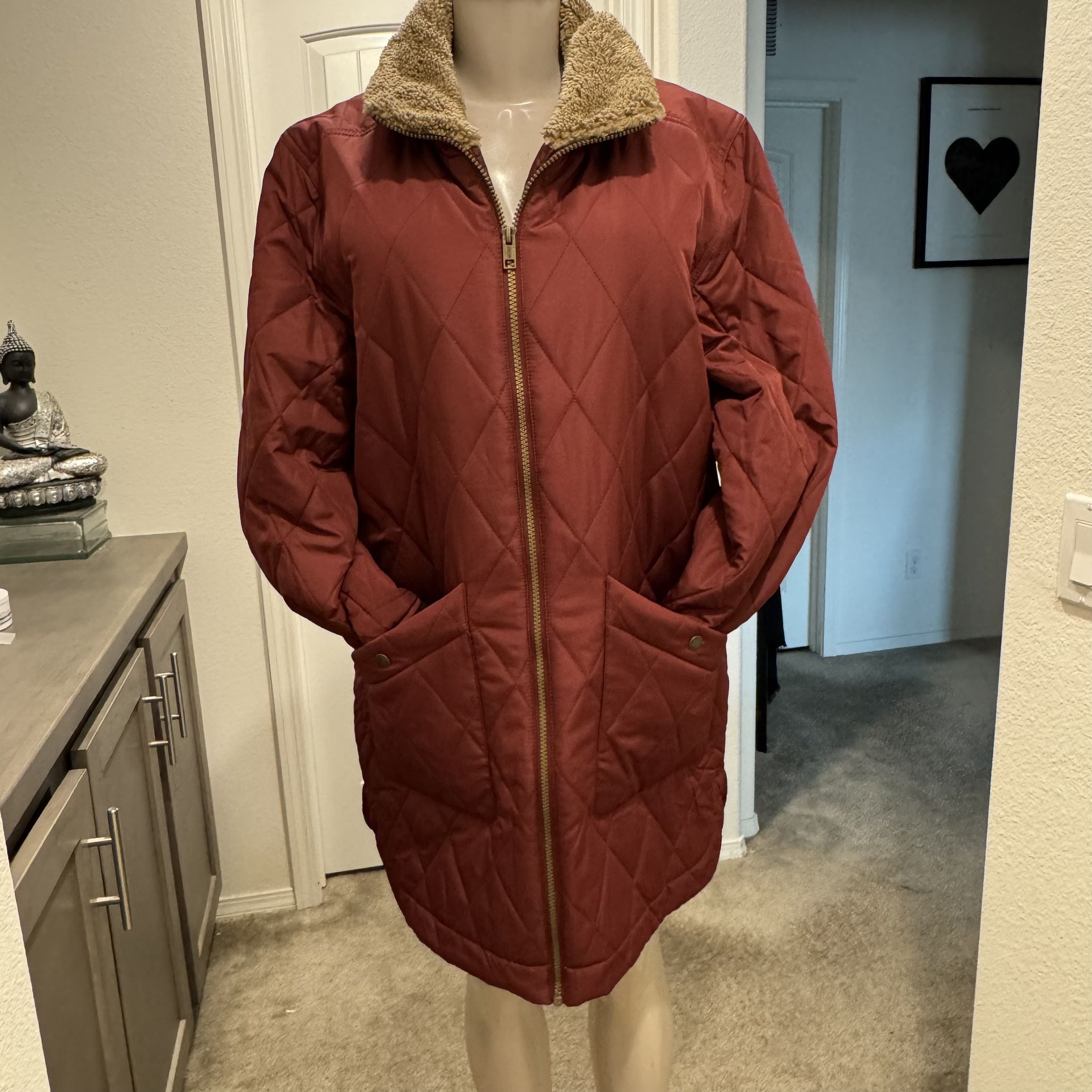 EstaThe jacket is a very nice color. I bought the waterproof jacket but never used it. The jacket is in good condition, I just lost the tag. Elegant quilted design. Warm tan collar. Ideal for cold weather. Long 34" shoulders 18" waist 22"sleeves 22" It's brand new, I just lost the tag