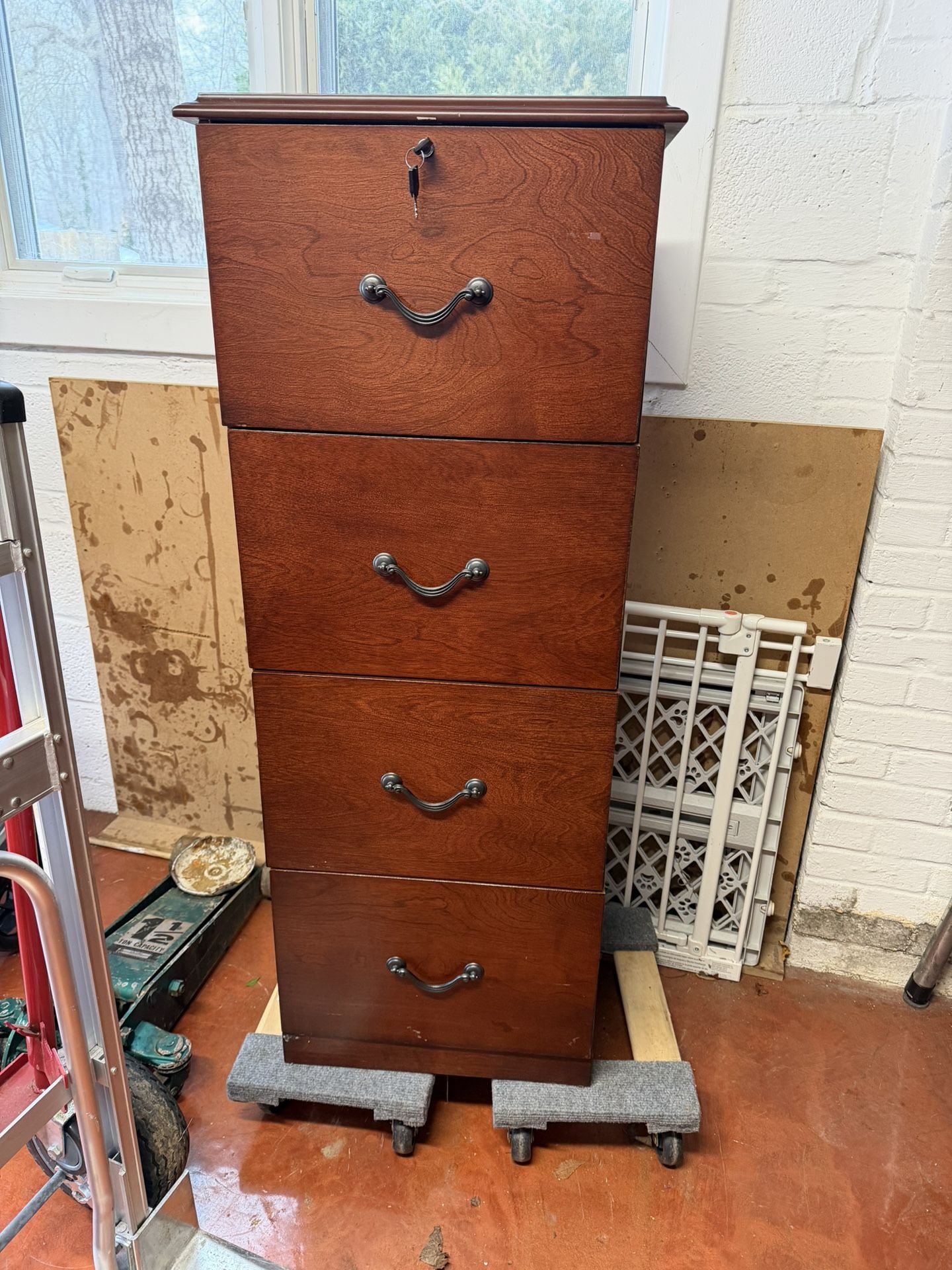 Sturdy 4 drawer file cabinet with lock and key. Adjustable file size. Solid cherry wood. Just off 495 at Little River Turnpike.