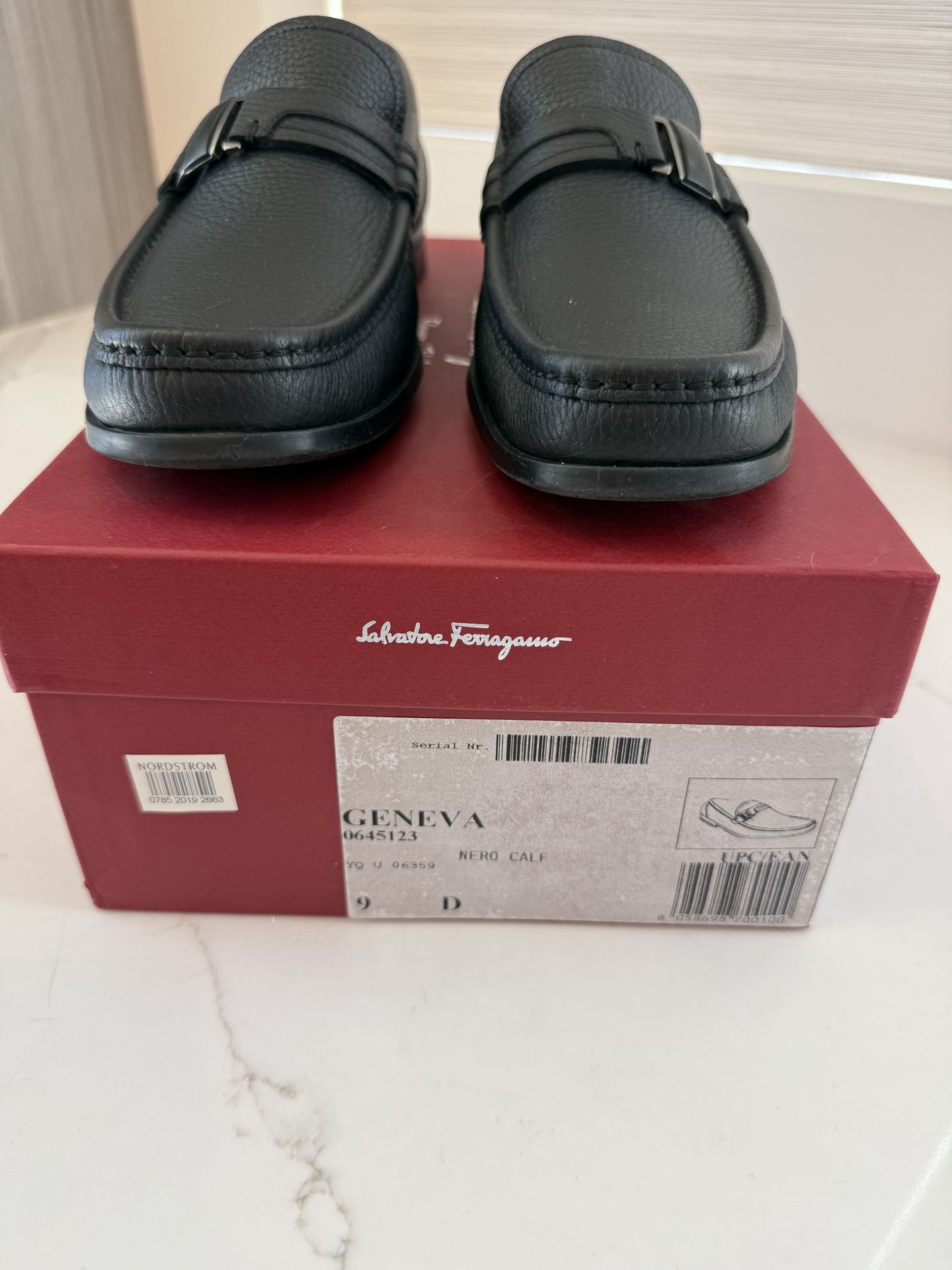 Authentic Ferragamo Geneva loafers in black calf leather with signature Gancini hardware. Made in Italy. Size: US Men’s 9 (D) Condition: Excellent, lightly worn. Includes original Ferragamo box and packaging. Classic luxury loafer that works with jeans, travel, or business casual. $275 OBO Also selling several other Ferragamo and Prada shoes — happy to bundle for a better deal.