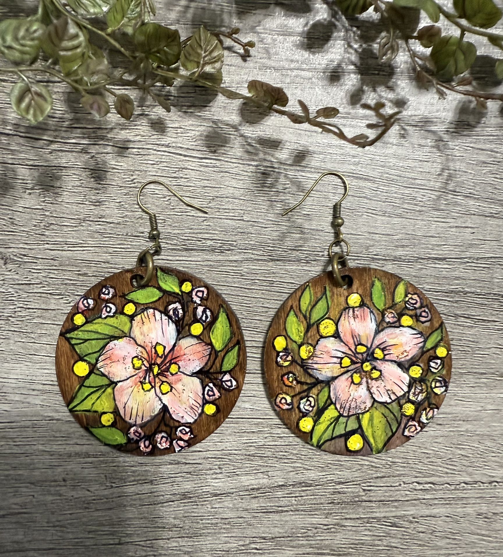 Floral Acrylic Painting Wood Earrings: Boho Bronze Dangles