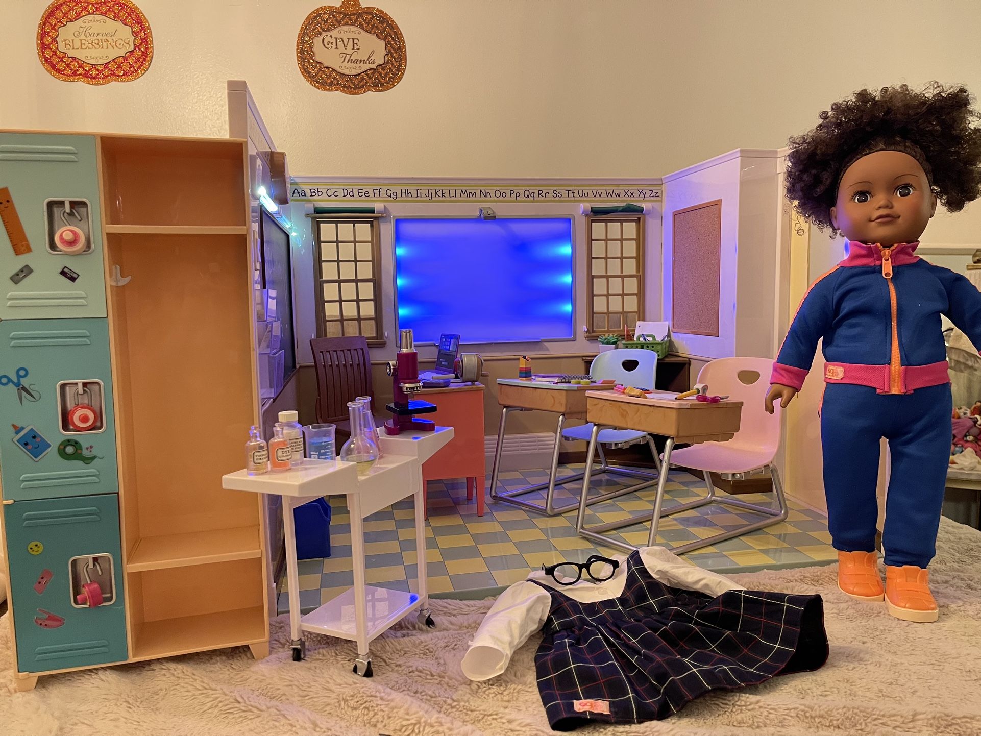 In great condition! Our Generation classroom with Doll, and Accessories for $75 The locker is included for free because it has a broken leg.