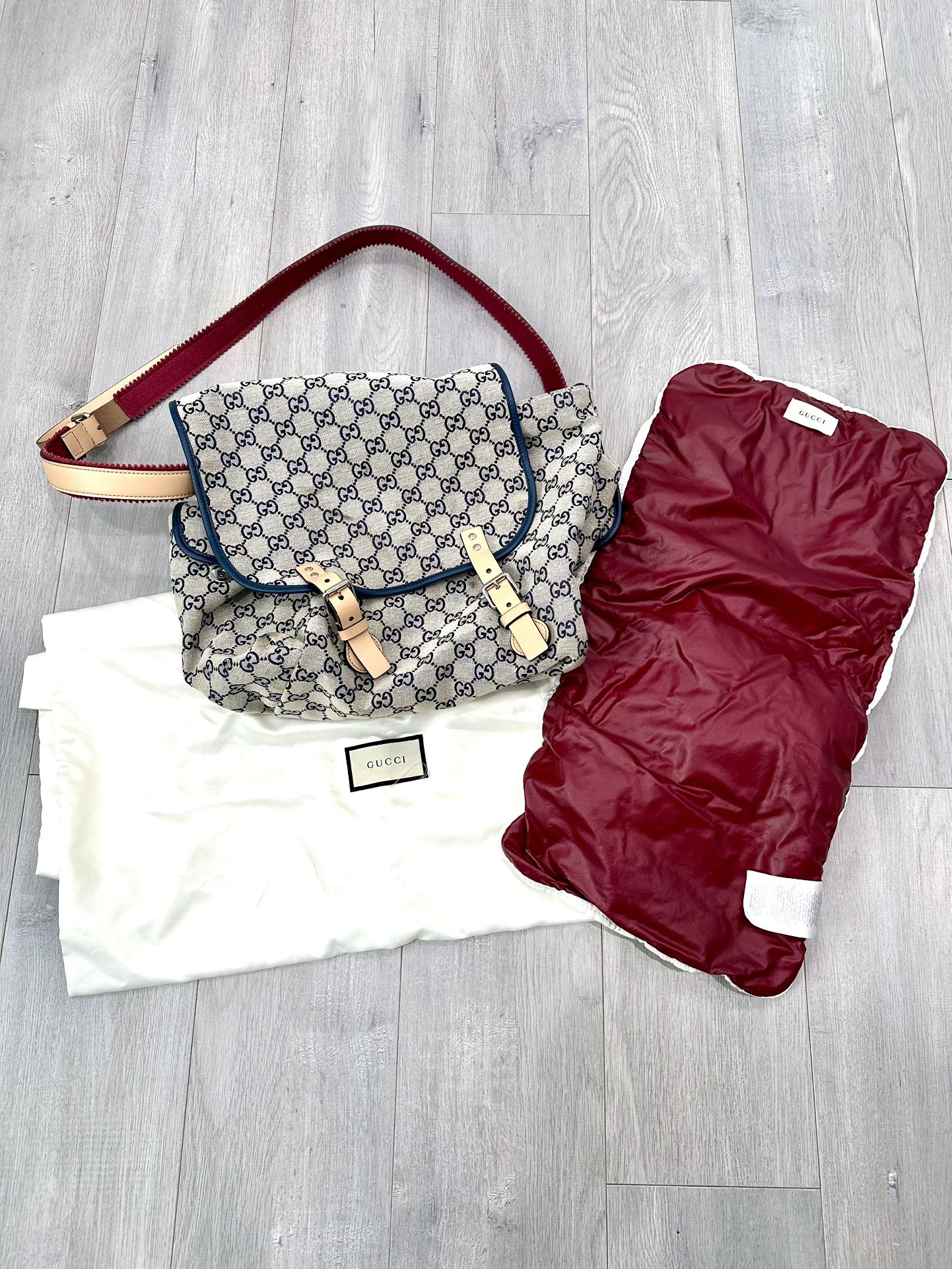 Preowned/used. Normal wear with some spots. -Gucci diaper bag -Canvas Shoulder Bag -Blue /Beige -model #606823 -comes with diaper change cloth and dust bag