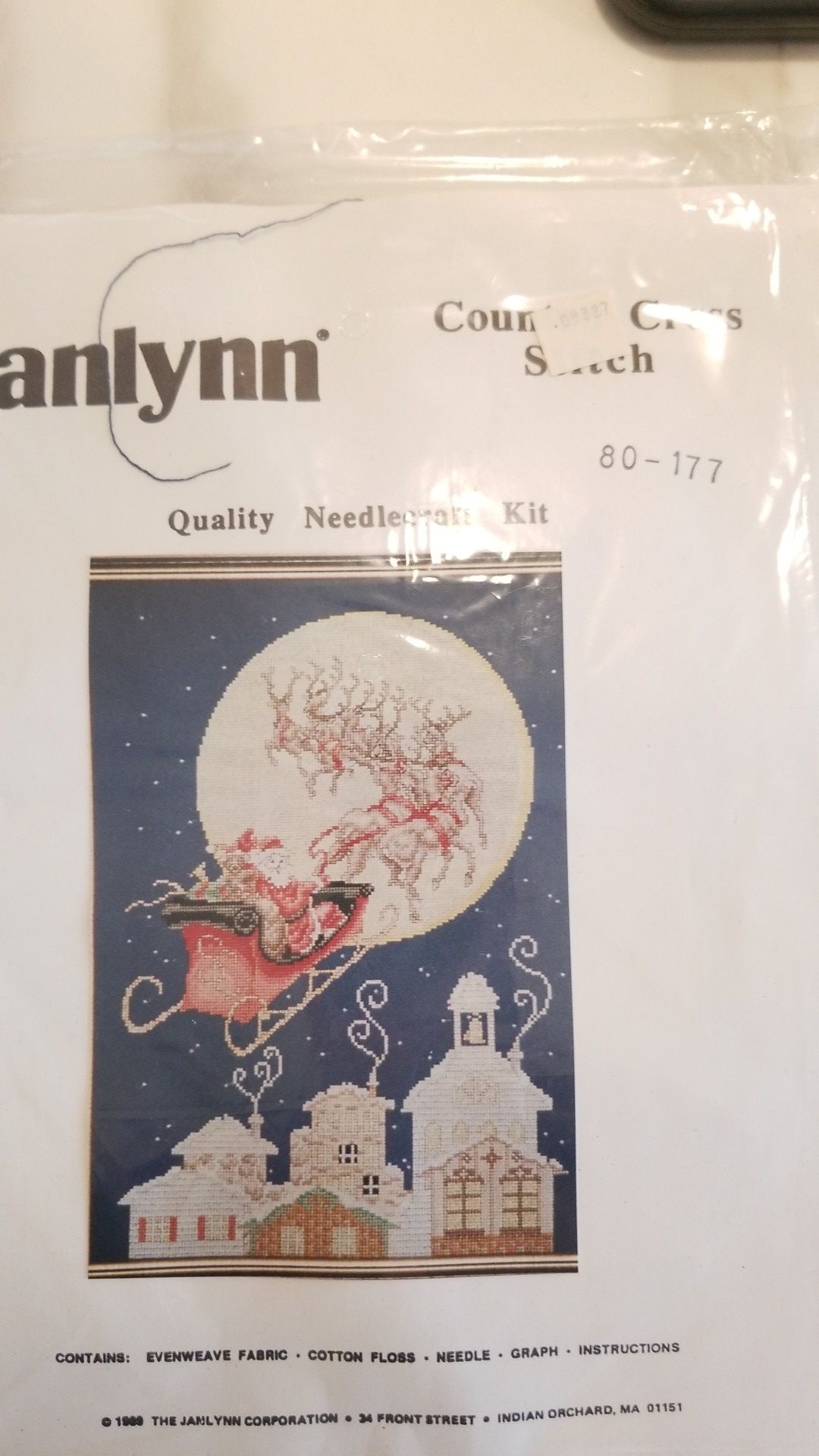 janlynn Christmas Santa Sleigh Counted Cross Stitch kit. #80-177. Brand new/Never used. Sealed package. Kit contains: Evenweave dark blue fabric, cotton floss, beads, needle, graph & instructions. Purchased in the early 90s.