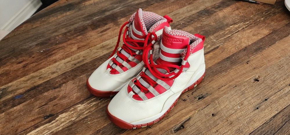 Jordan 10s, Red Steel. Size 5y. These shoes are 20 years old! They are in great condition and shape! Can be worn , there is no coming apart of the shoes. But remember they are 20+ years old so wear carefully. 💯 Authentic!