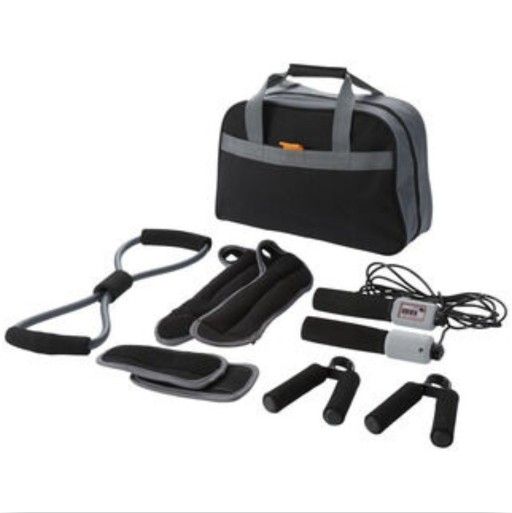 KaufmanHall branded home 9 piece fitness kit The kit includes: - 600D polyester Zippered case with front pocket - Hand grips × 2 - Exercise/Resistance bands with handles - Ankle or wrist weights x 2 - Weight inserts/Comfort pads x 2 - Jump rope with a counter Approximate Dimensions and Weight: 12.5"L×9"W×4"D, 3.94lb Only the Resistance band was tried. New Open Box Internal code no 00079