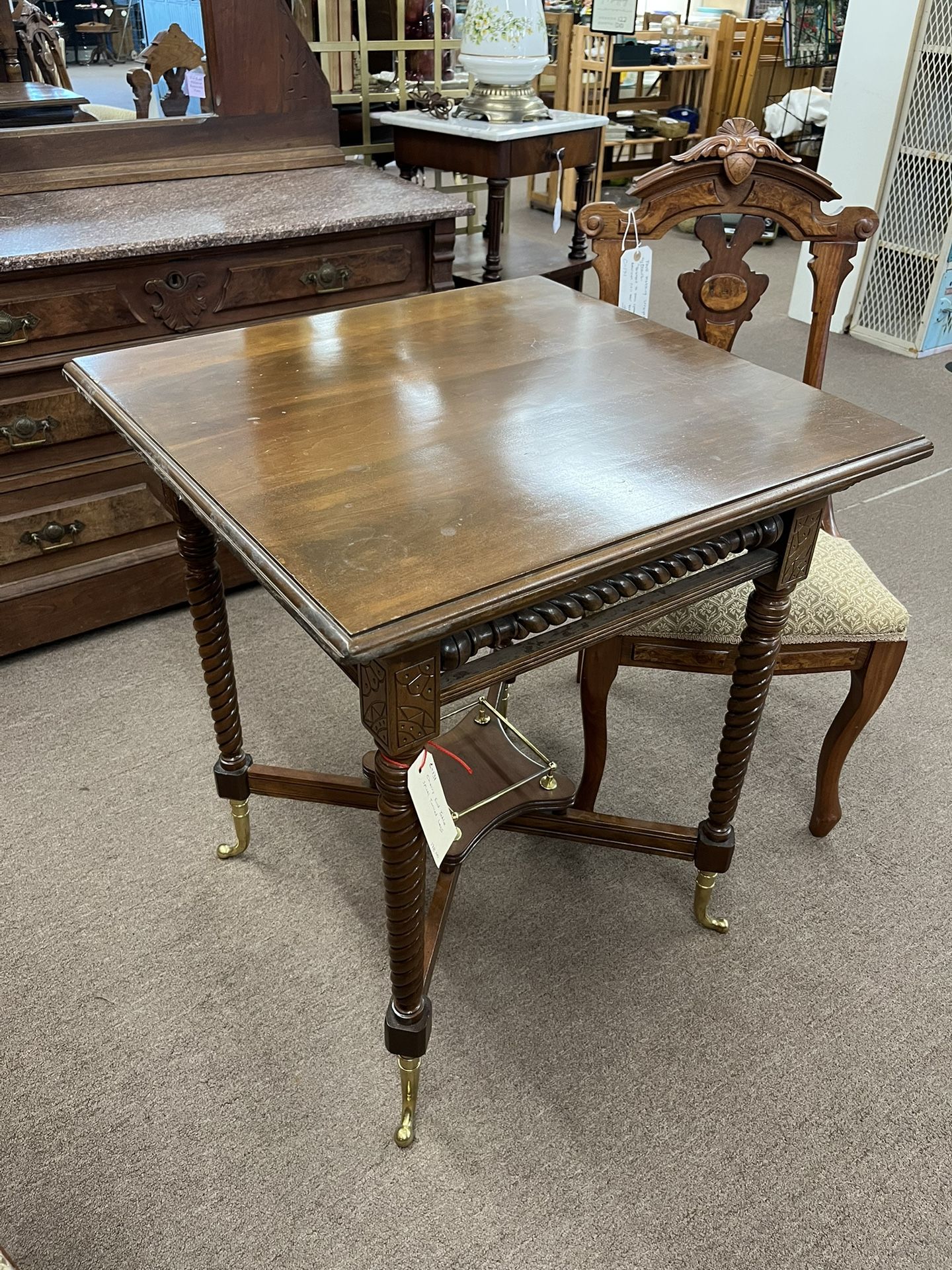 Antique square side table with spiral legs and brass hardware. This can be found in booth D1. See photos for location and other info Measures about: 26” wide, 25” deep, and 30” tall