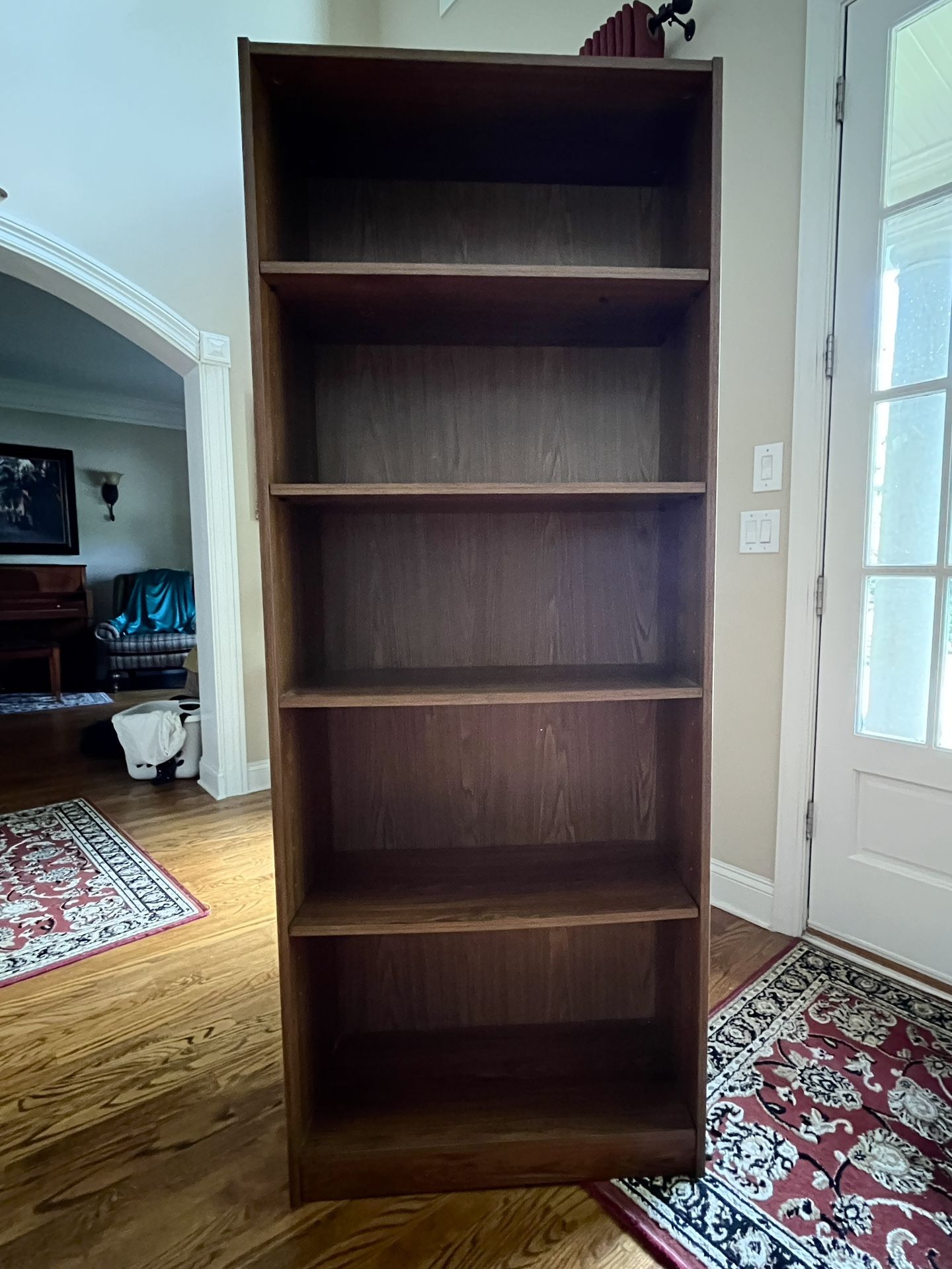 This tall bookshelf is made from sturdy engineered wood and features a sleek laminate wood finish. Measuring 72” high, 28” wide, and 12” deep, it offers ample vertical storage without taking up much floor space. Includes five adjustable shelves, perfect for books, décor, or office essentials. In great condition. Books in the picture are not included.