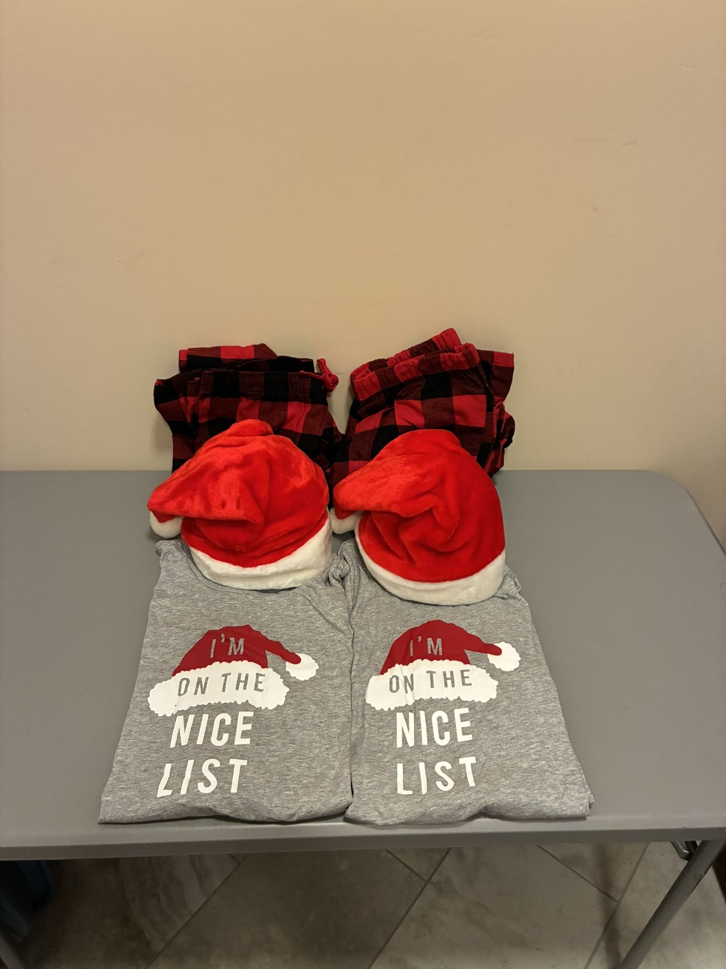 Tags still attached. I’m on the Nice List’ long sleeved pajama tops grey, with red and black long pajama bottoms, and helmet style Santa caps. One top is adult small and the other is adult medium.