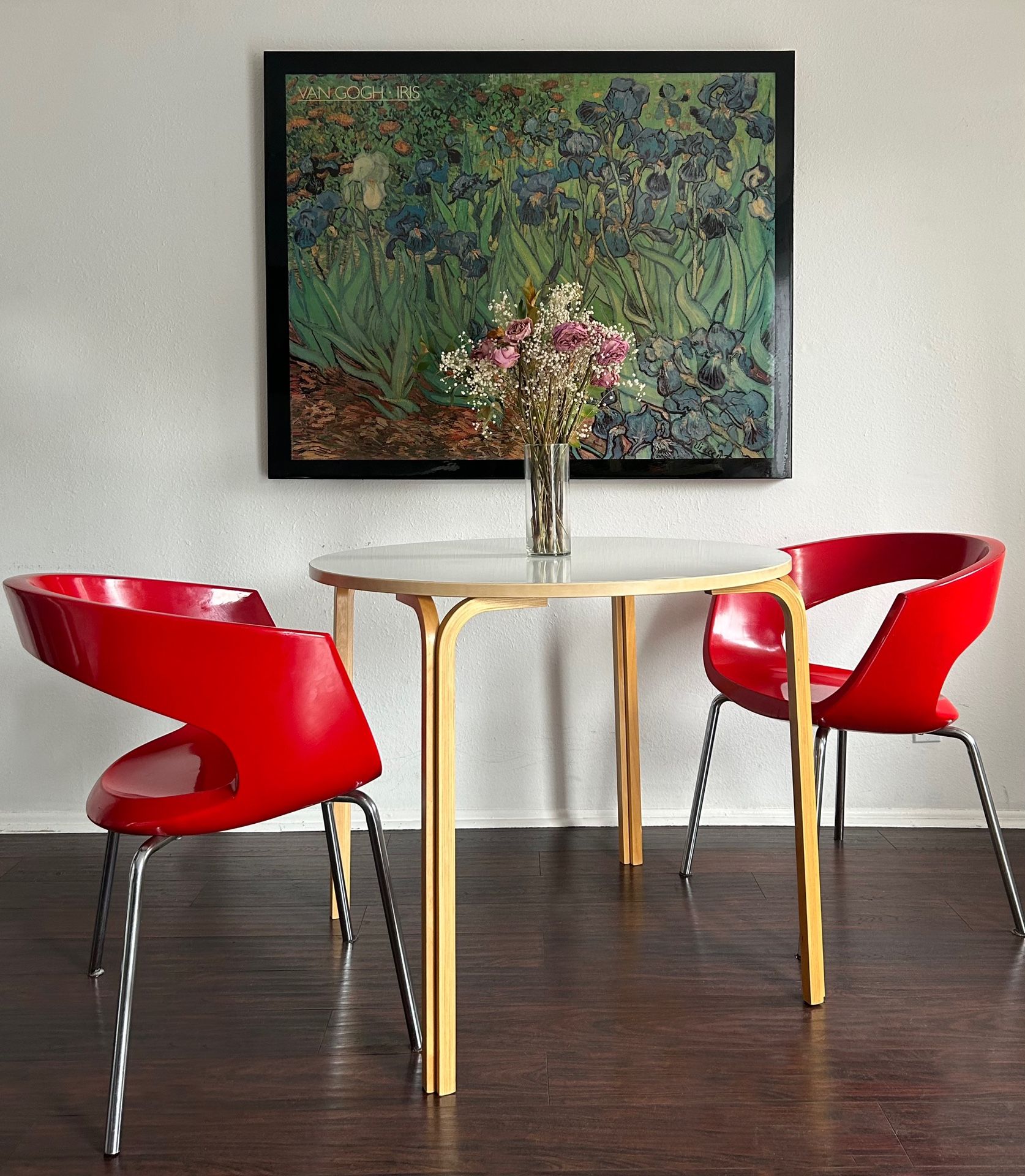 Gorgeous vintage 1990s / 2000s IKEA SVANTE round dining table with a white laminate top & birch bentwood legs. In overall good vintage condition with a couple knicks (just see close up photos). Such a cute, intimate dining table. Set of (2) red dining chairs in photos are listed separately for ($120)! Width 35.5” Height 29” 5/8” Pick up in LA or delivery available with a fee!