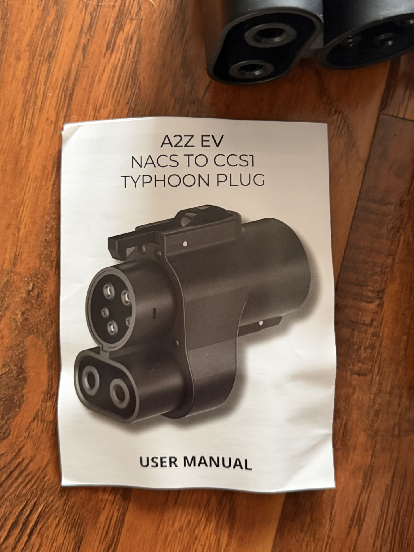 This item is an A2Z EV adapter, likely the Typhoon PRO model, used to charge non-Tesla electric vehicles at Tesla Supercharger stations.