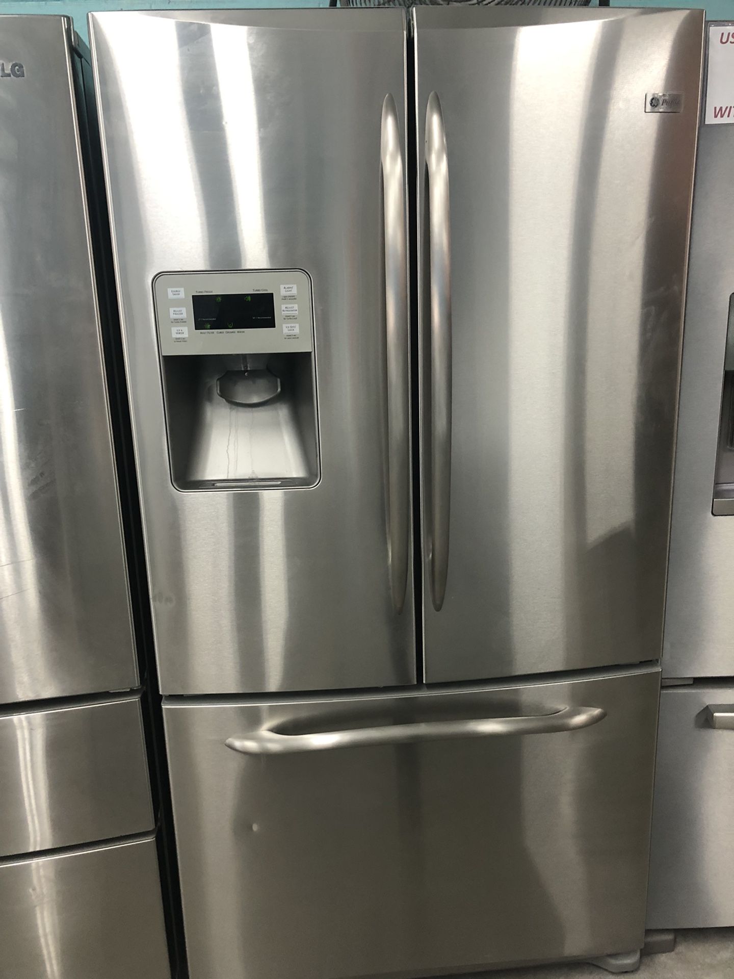 GE Profile stainless french door refrigerator,36” wide 69” high 32” deep. Food section has adjustable split spill proof glass shelves 2 humidity controlled crispers adjustable gallon size door bins and new style LED lighting. Freezer is a pull out draw with 2 solid plastic baskets. Refrigerator is plugged in and running. Comes with warranty. Financing and delivery available.